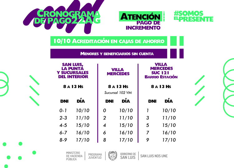 Aquellos beneficiarios que cobran por ventanilla por ser menores de edad o por no tener cuenta bancaria, estarán percibiendo el pago entre el 10 y el 17 de octubre, según la terminación de su DNI. Deben acercarse a la sucursal correspondiente a su domicilio, de 8:00 a 13:00.
