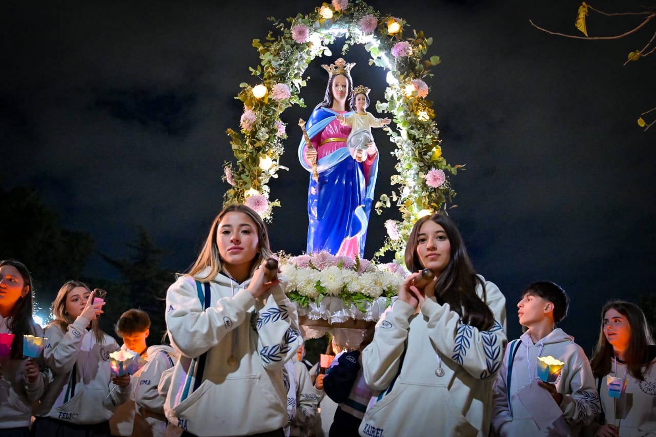 Mientras continuaba el espectáculo, cuatro alumnas irrumpieron en el patio, llevando sobre sus hombros la figura de María Auxiliadora. La promo ‘Teuffarios’ encabezó la caravana, que inició sobre el pasaje Ibañez en dirección a Hipólito Irigoyen, dobló hacia Las Heras y regresó por Ituzaingó. A lo largo de todo el trayecto salieron vecinos con imágenes, rosarios y decoraciones para acompañar el homenaje.