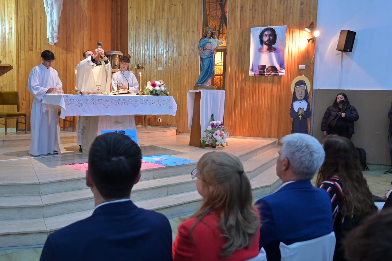 Como en las vísperas de cada 24 de mayo, la comunidad educativa de la tradicional escuela se congregó previamente en la capilla para rendir homenaje a quien inspiró su nombre. Este año, el gobernador Claudio Poggi acompañó el evento y caminó junto con directivos, docentes, alumnos, familias y vecinos.