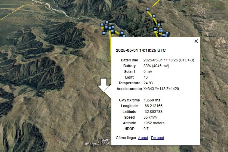 “Volo hacia el sur, a unos 9 Km del lugar de suelta. El último dato (flecha blanca) es de este sábado a las 11 de la mañana, iba volando a 35 Km/h a más de 1900 metros sobre el nivel del mar. Hermoso”, señaló Jácome.