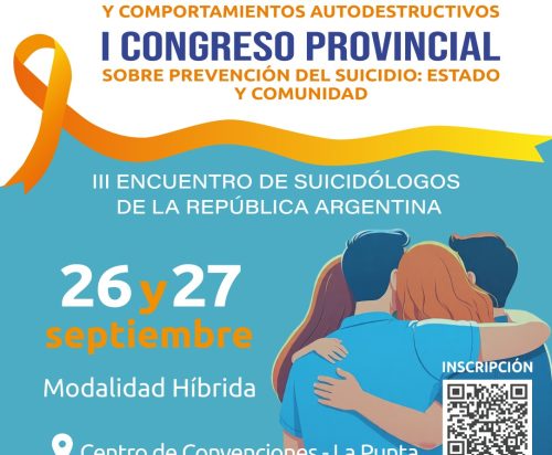 El Primer Congreso Provincial sobre Prevención de Suicidio, Estado y Comunidad tendrá lugar el 26 y 27 de septiembre en el Centro de Convenciones de La Punta. Se trata del tercer encuentro de suicidólogos de la República Argentina.