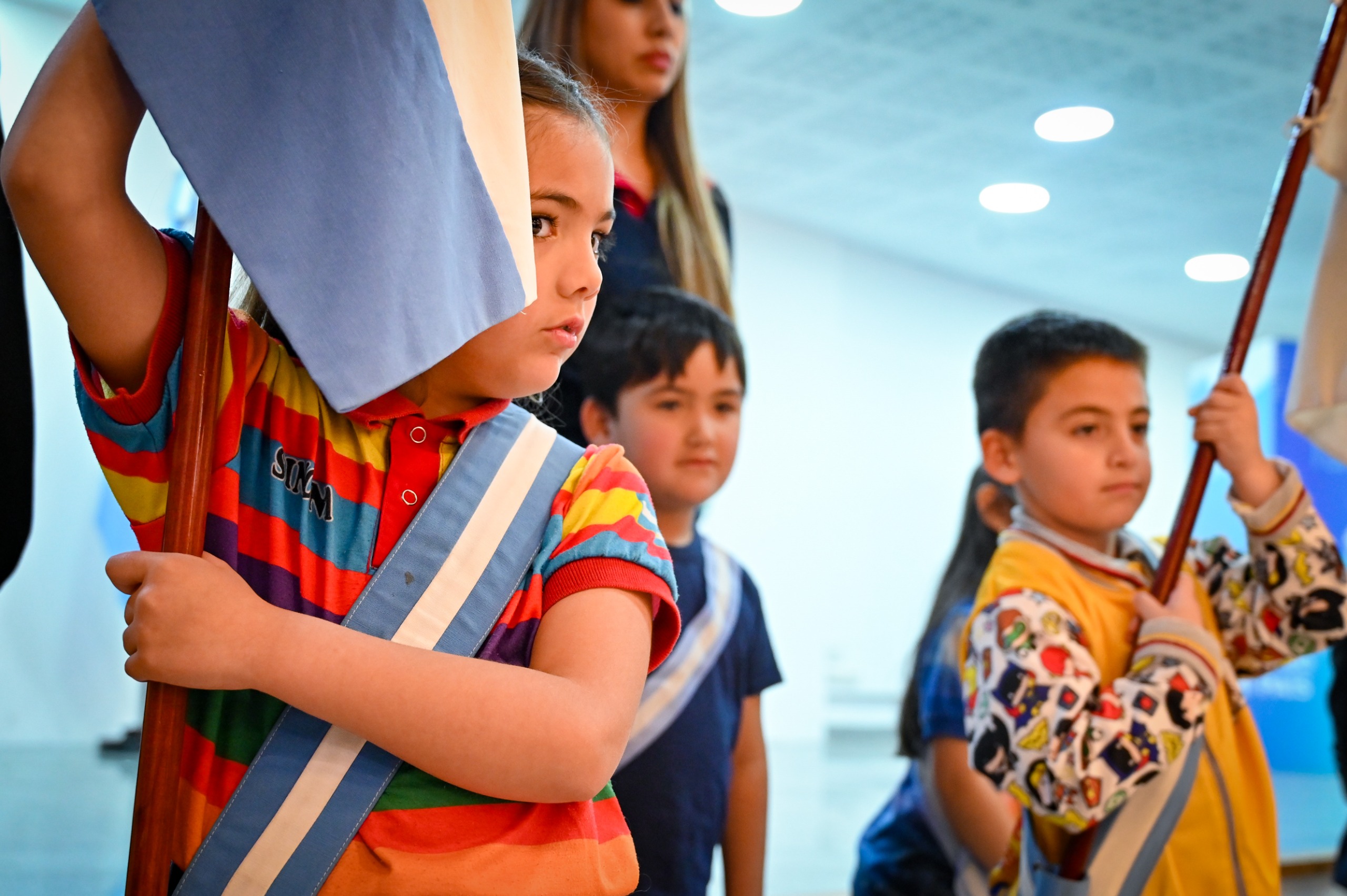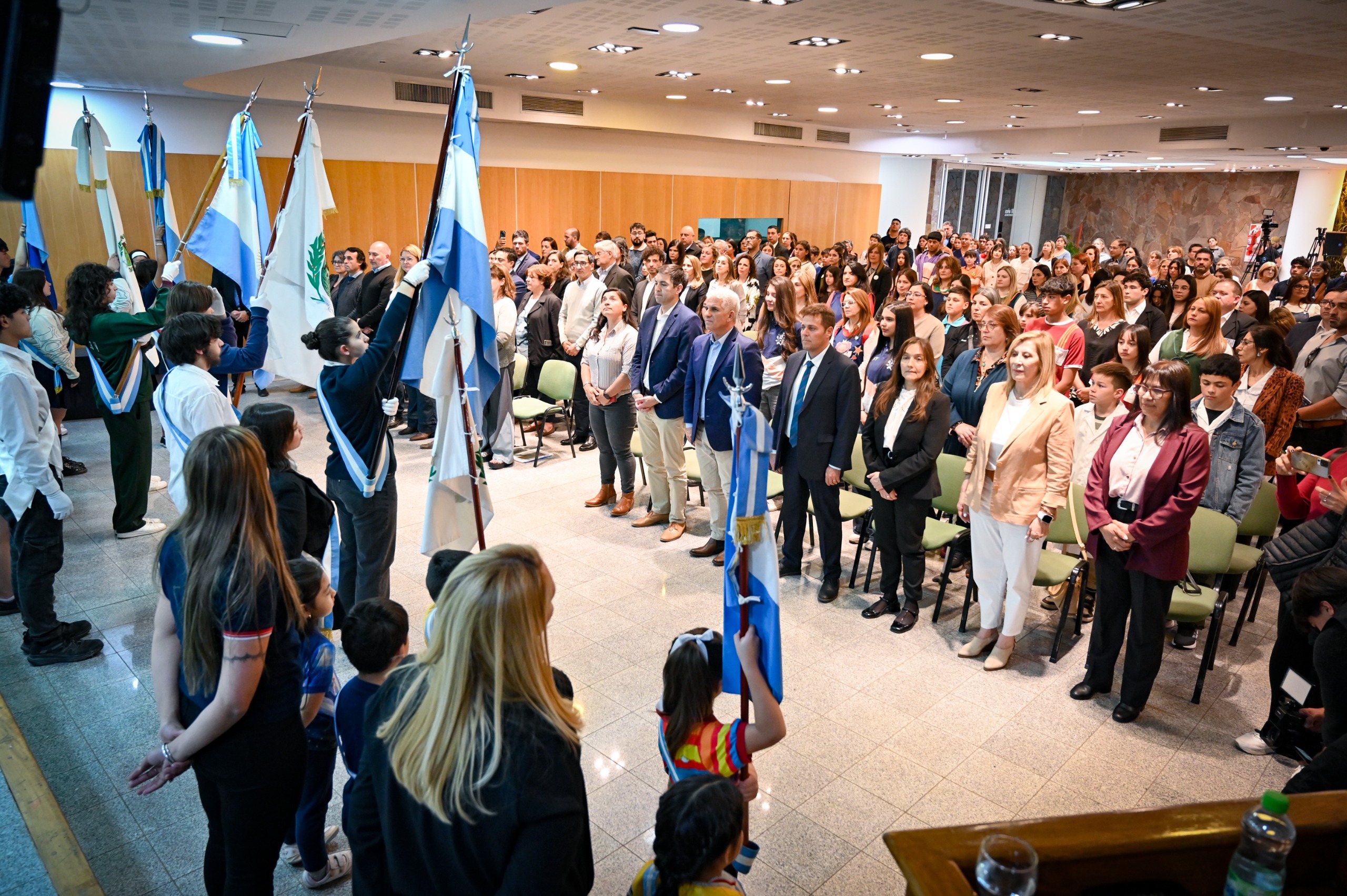 La jornada comenzó con la entrada de las banderas de ceremonias, recibida con aplausos, portadas por alumnos de diferentes centros educativos, que seguidamente se encaminaron a ubicarse frente al escenario. Luego, entonaron de pie las estrofas del Himno Nacional Argentino.