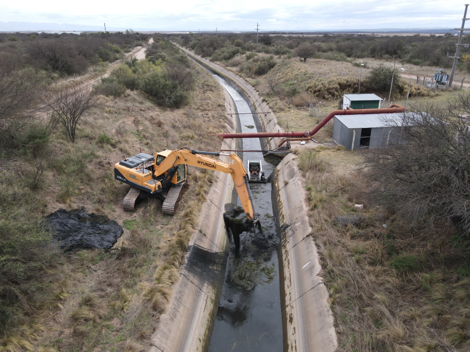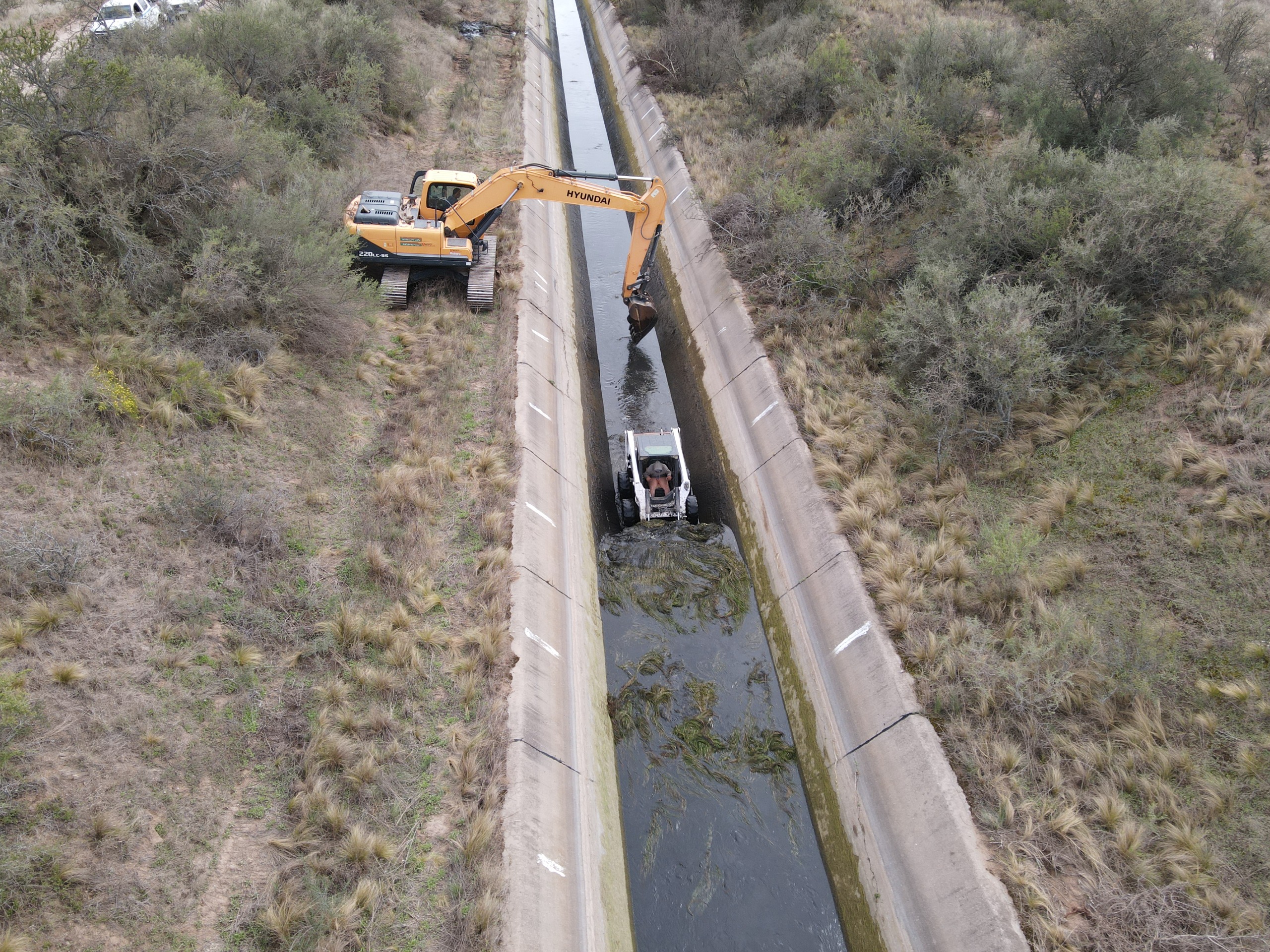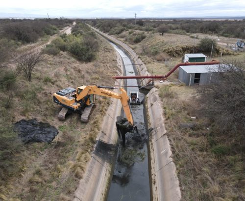 Los trabajos de mantenimiento comenzaron donde se origina el canal, a la salida del dique Paso de Las Carretas. Allí ingresaron maquinaria vial dentro del canal y de manera cautelosa arrastró todo tipo de material dentro del mismo.