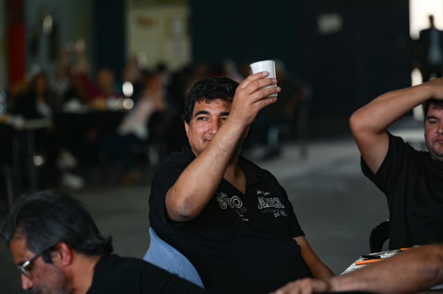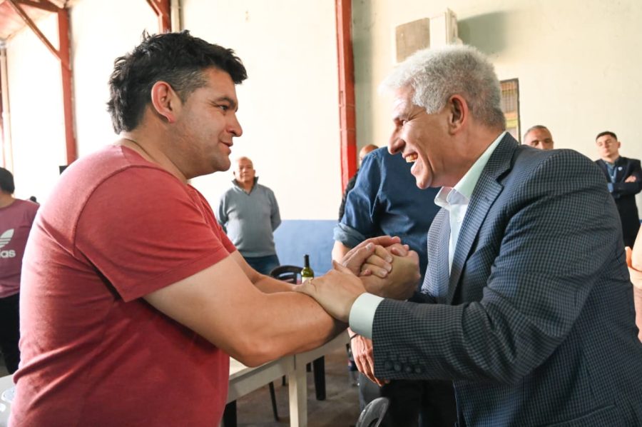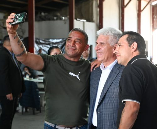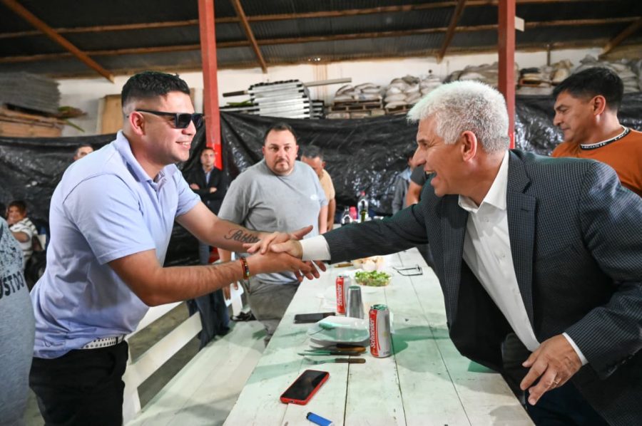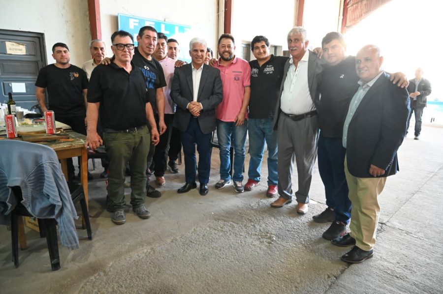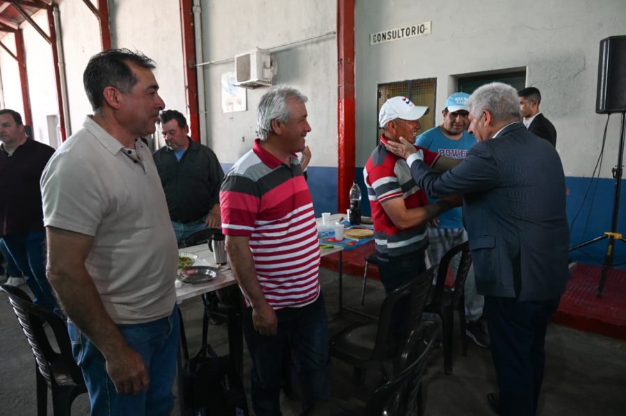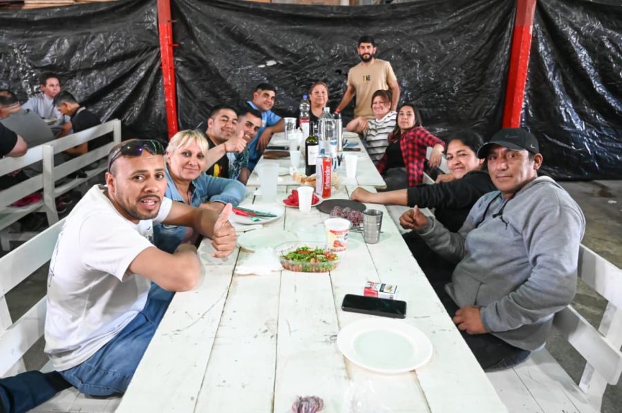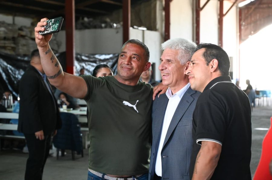 Luego el Gobernador ingresó al galpón y pasó mesa por mesa saludando a los trabajadores, quienes lo recibieron entre abrazos, risas y selfies.