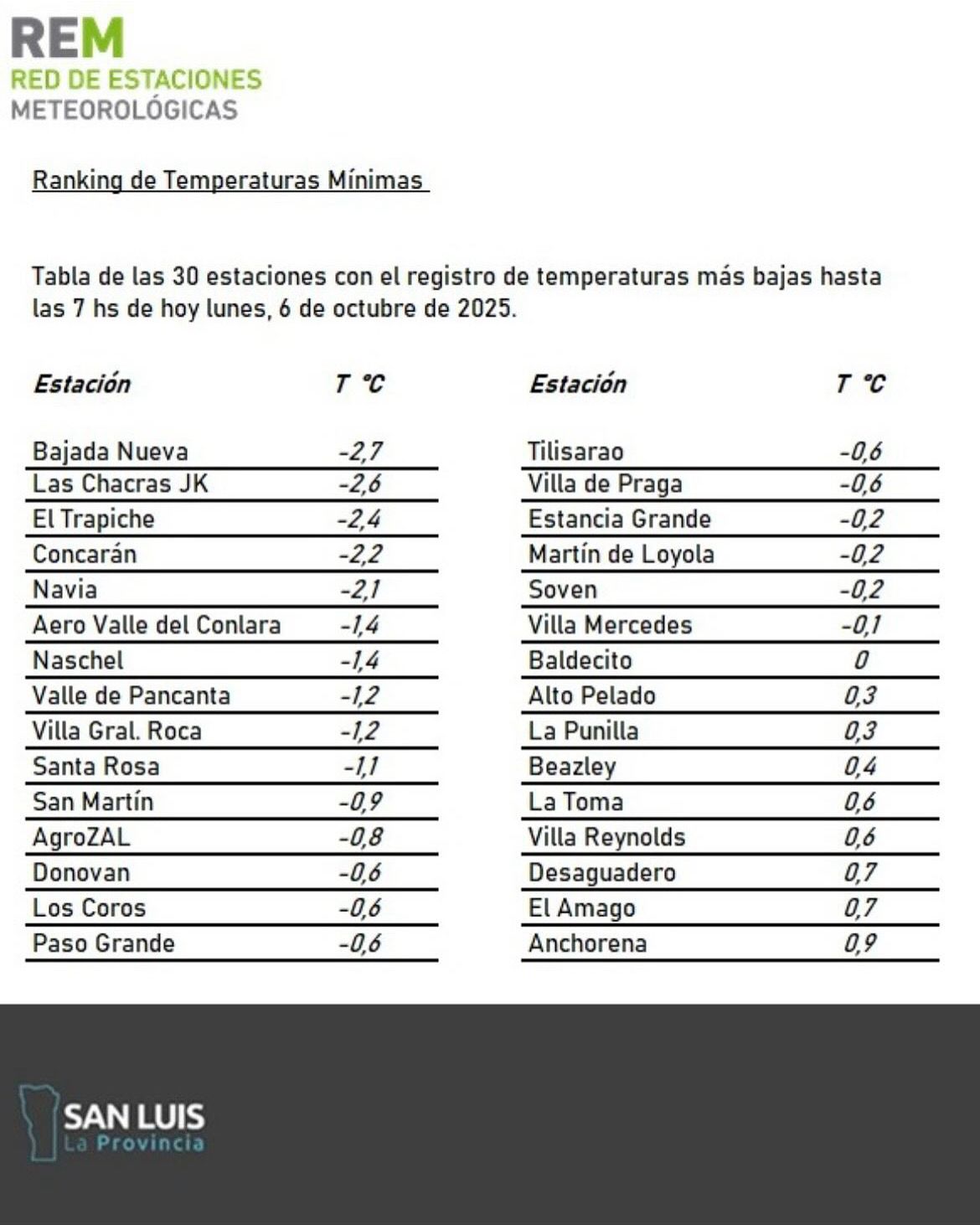 Tras las temperaturas de verano que reinaron hasta el sábado, el ingreso de un frente frío del sur y la caída de granizo en varias localidades parecieron retrotraer el termómetro de nuevo al invierno. Después de una baja abrupta de la temperatura el domingo, la segunda semana de octubre comienza comienza con mañanas frías y chance de heladas en varias localidades. A pesar de que la mínima promedio fue establecida en 3°, Bajada Nueva, Las Chacras y El Trapiche amanecieron con térmicas por debajo del cero.