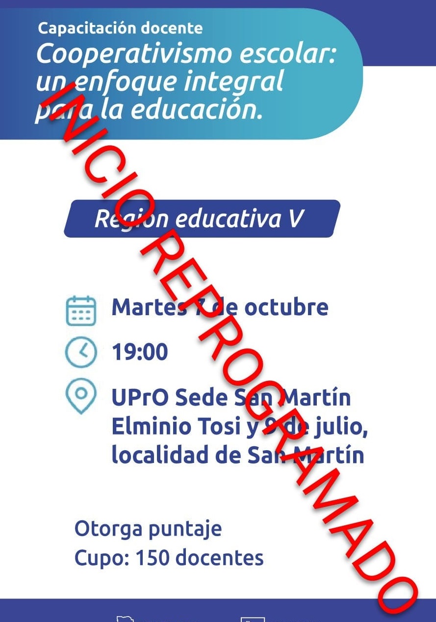 La dirección de Cooperativas y Mutuales informó que se reprogramó el inicio del ciclo de la capacitación denominada ‘Cooperativismo escolar: un enfoque integral para la educación’ destinada en esta oportunidad para los docentes de la Región Educativa V y que la decisión responde a cuestiones operativas y de logística.