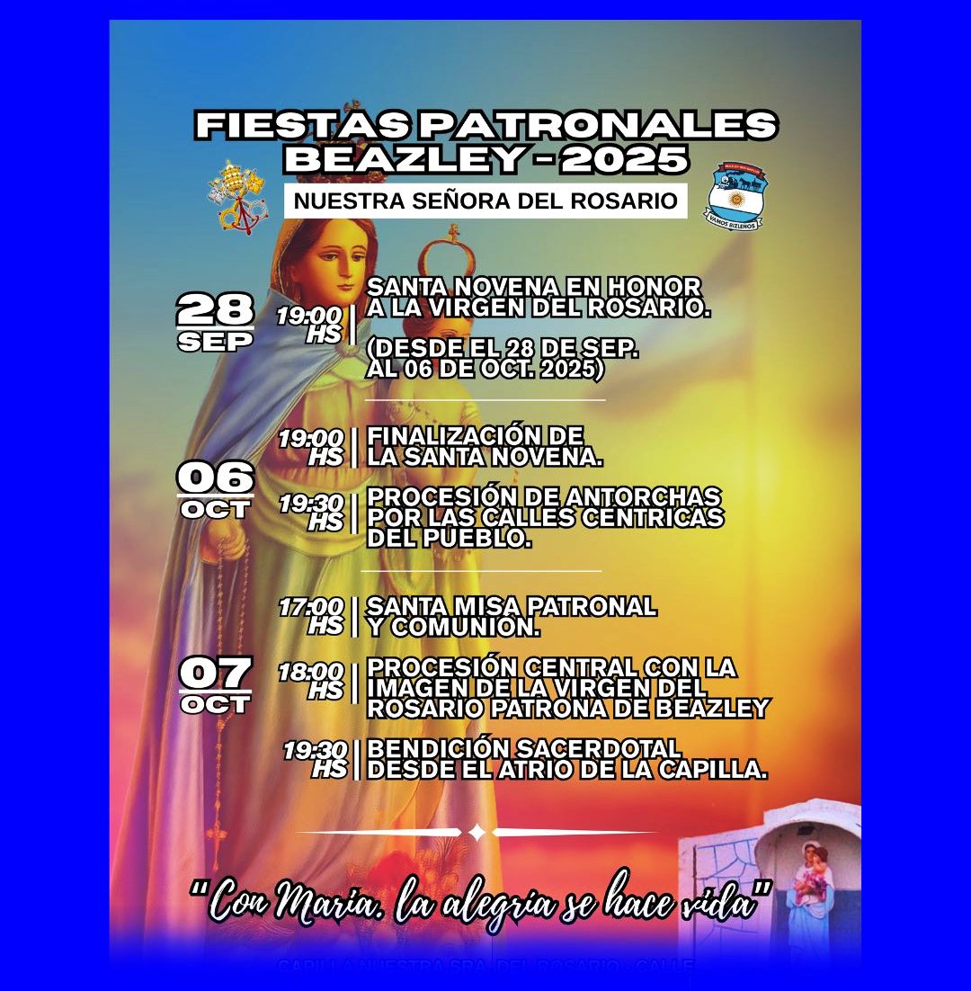 La devoción a Nuestra Señora del Rosario tiene raíces que se remontan a los primeros años de formación del pueblo. Beazley, con su historia ligada al trabajo rural, al ferrocarril y al espíritu solidario de su gente, adoptó desde antaño a la Virgen del Rosario como su patrona protectora, invocándola como guía espiritual y símbolo de esperanza.