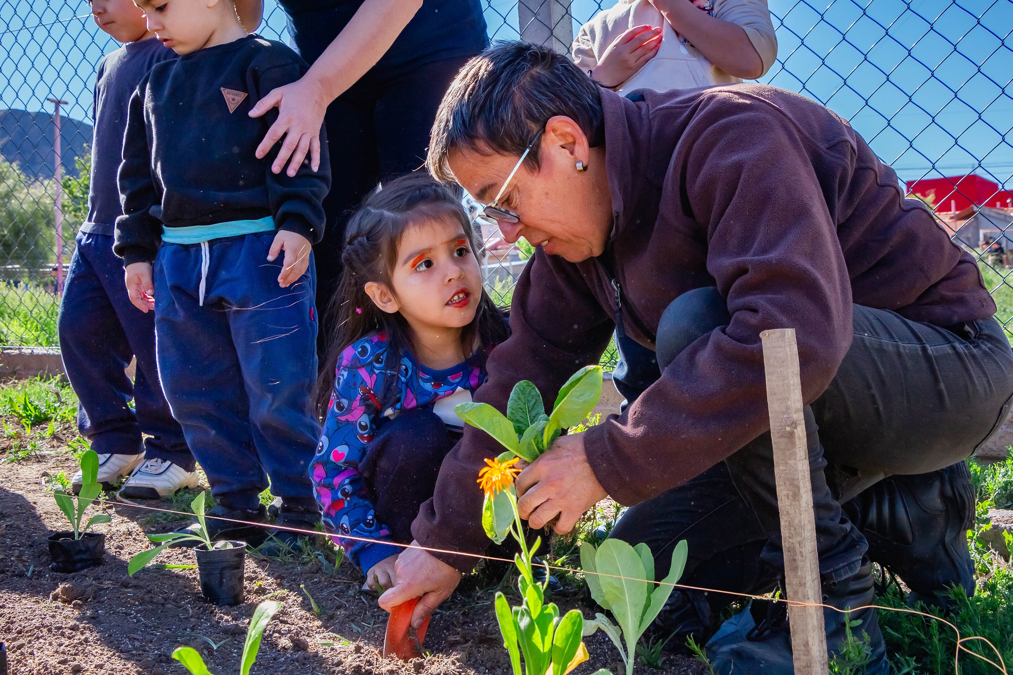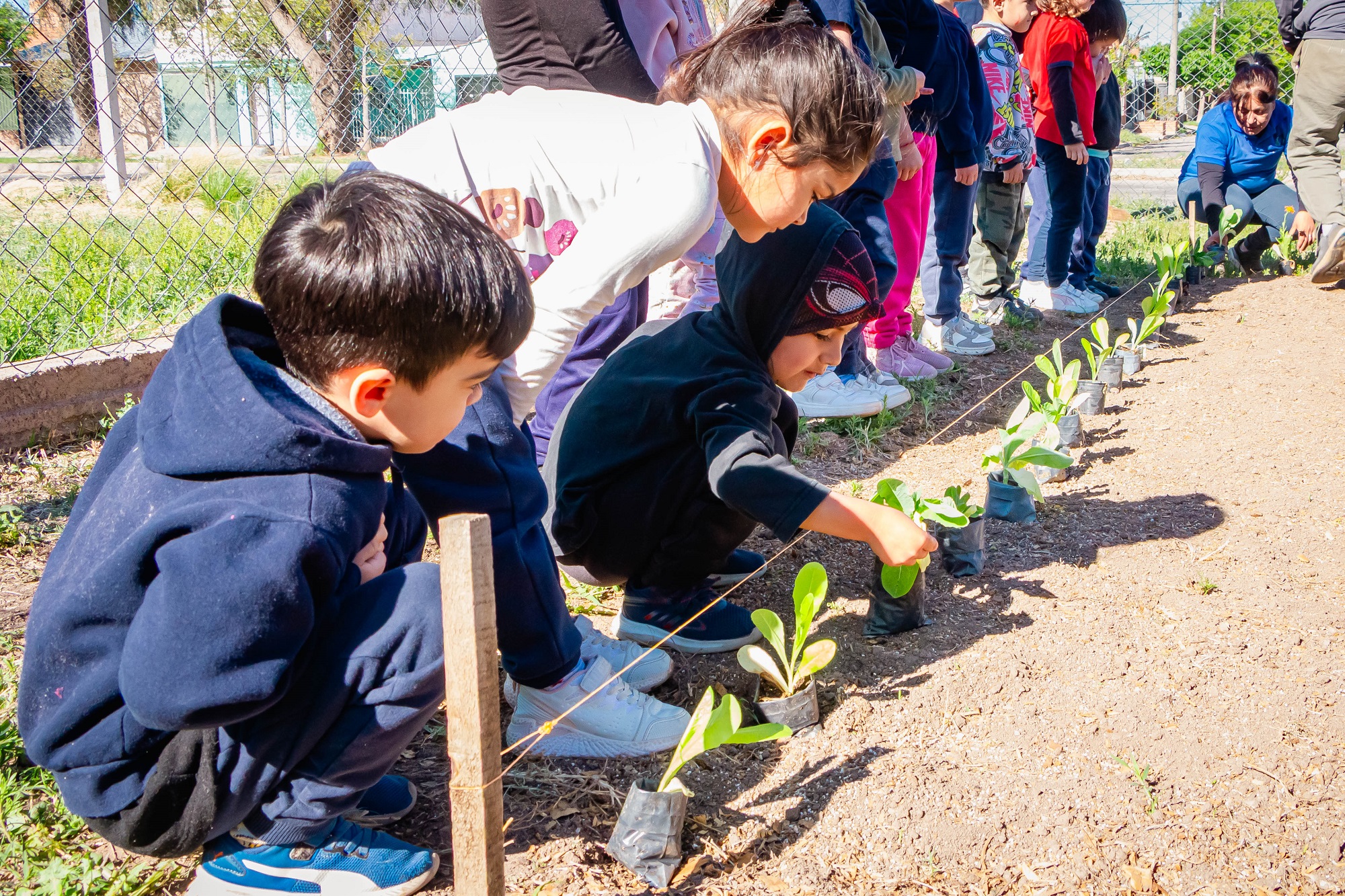 El personal de la dirección de Emergencia Social fue responsable de la disposición y plantación de las primeras hortalizas. La iniciativa se realizó en conjunto con los alumnos del nivel Inicial y autoridades de la institución educativa.
