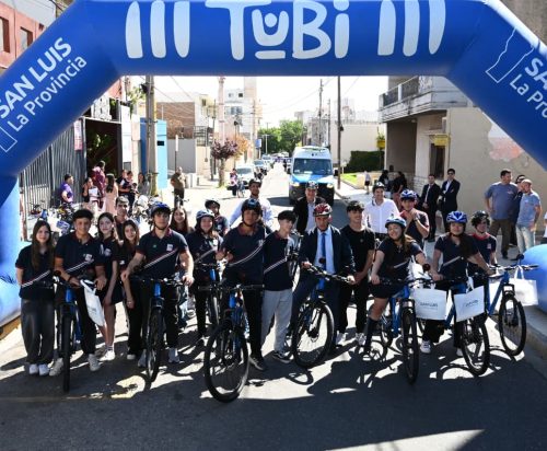 El gobernador Claudio Poggi le entregó las TuBi a los estudiantes de 5° año de la institución educativa. Luego, compartió un agradable momento al recorrer con ellos las calles de la Capital sanluiseña.