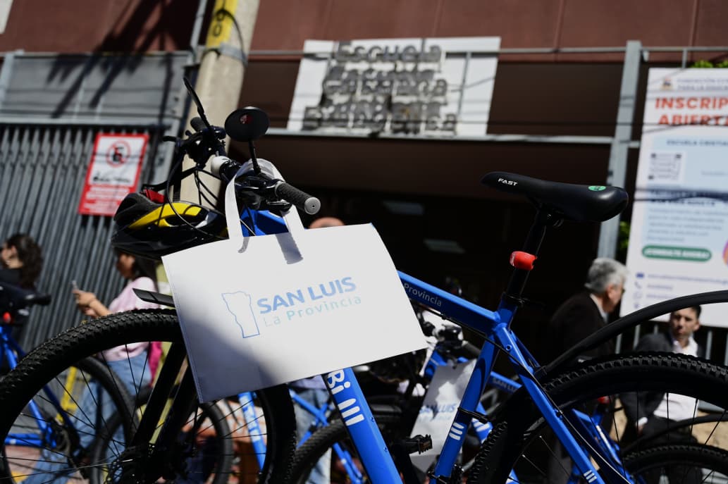 Tras explicar la importancia de la actividad física en la salud de los chicos, el Primer Mandatario agregó que “estas bicis han sido ensambladas, pintadas e incorporados los elementos de seguridad por bicicleteros de la provincia de San Luis, inclusive de la ciudad de San Luis. Entonces generó un trabajo también en el rubro de la bici”.