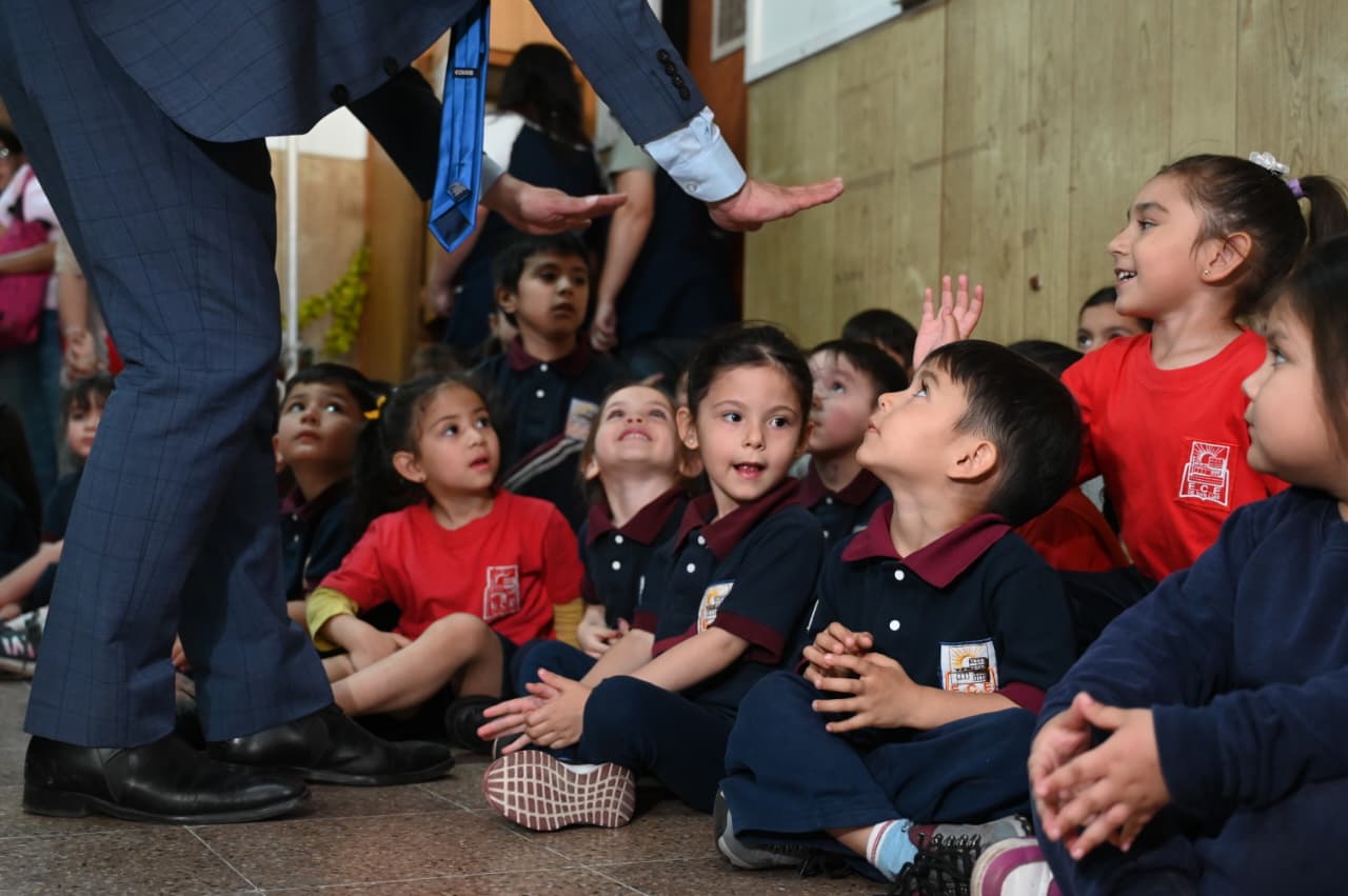 El Primer Mandatario arribó a la escuela ubicada en calle Las Heras y saludó afectuosamente a los miembro de la comunidad educativa, quienes lo esperaban ansiosos en el Salón de Usos Múltiples (SUM). Allí, los chicos del del nivel Inicial de la casa de estudios sorprendieron al Gobernador con la entonación dos canciones: una cristiana llamada ‘Busco por aquí, busco por allá’ y la tradicional ‘Pequeño Pez’.