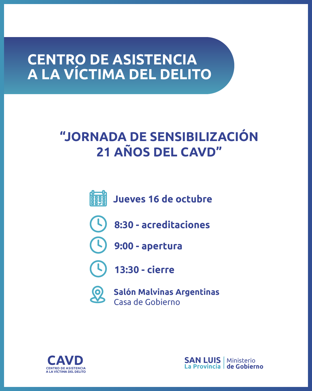 El ministerio de Gobierno, a través de la dirección de Derechos y Garantías Constitucionales, invita a participar de la ‘Jornada de Trabajo por los 21 Años de Creación del Centro de Asistencia a las Víctimas del Delito’(CAVD), que se realizará en el salón Malvinas Argentinas.