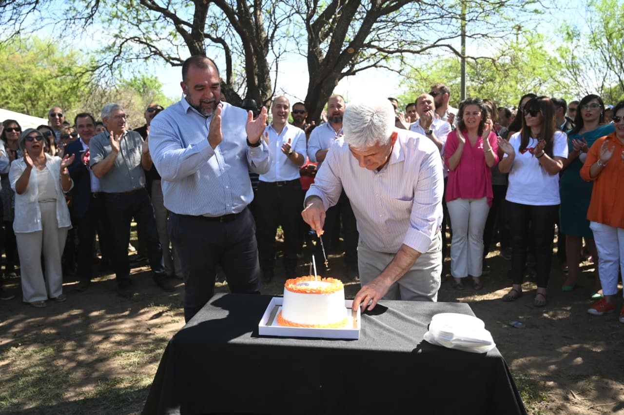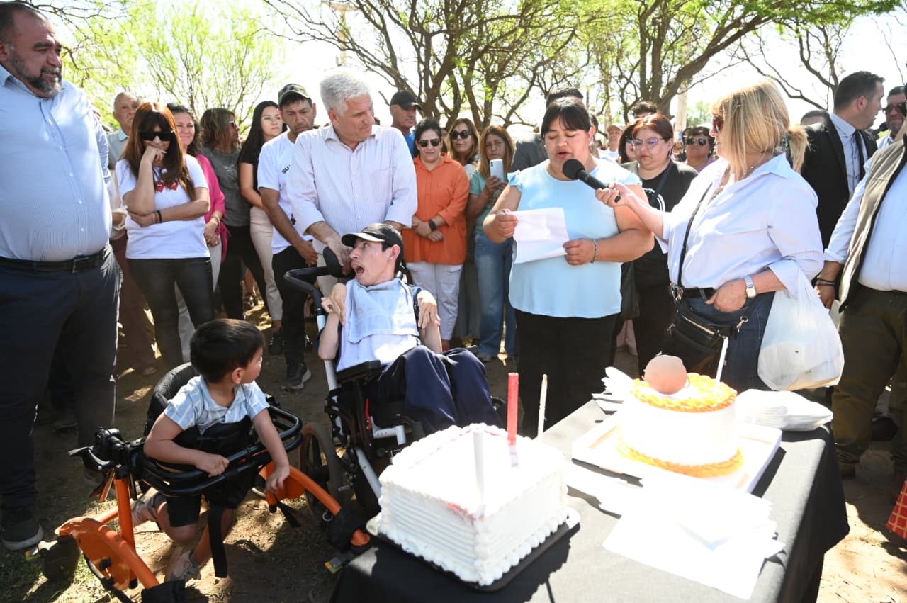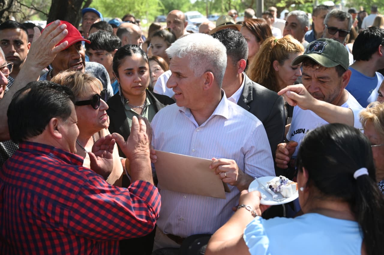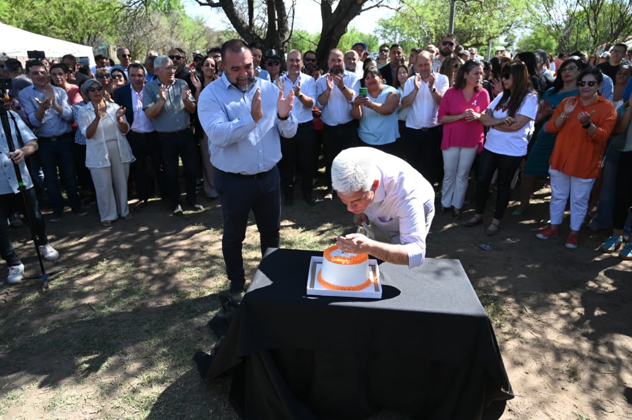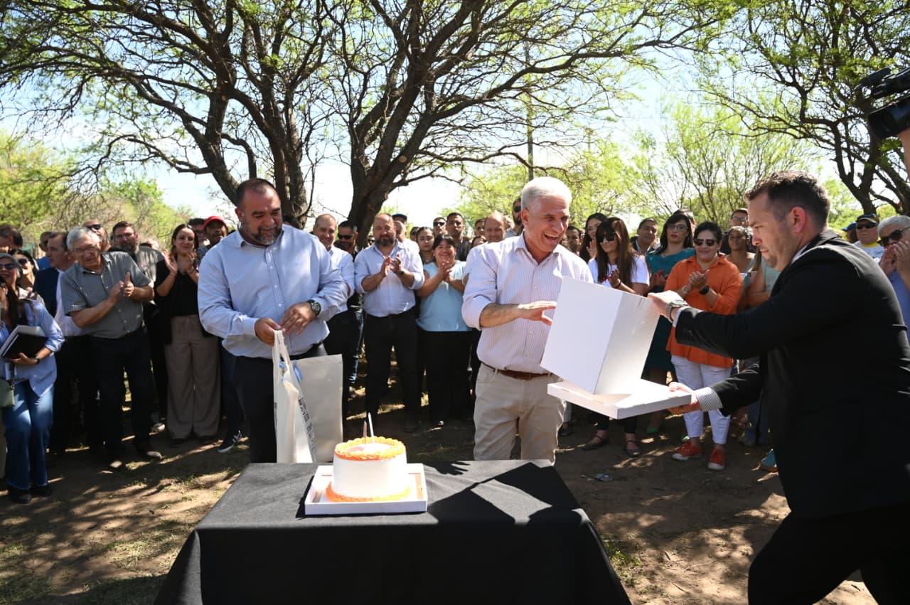 Fuera de protocolo, tanto las autoridades como los vecinos aprovecharon la ocasión para saludar al gobernador Claudio Poggi por su reciente cumpleaños, entregándole un obsequio de una tienda local y compartiendo luego una torta con todos, en un gesto de cercanía y calidez que cerró la jornada con aplausos y emoción.