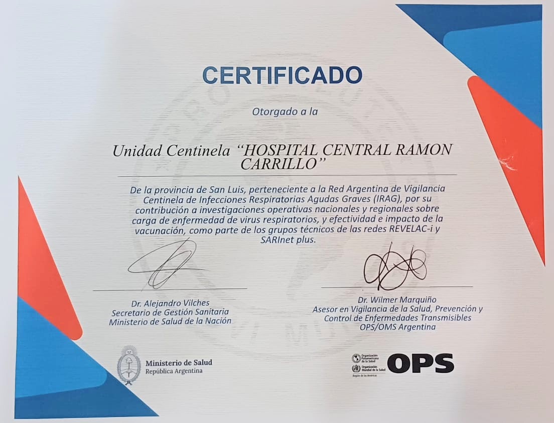 El certificado entregado reconoce al Hospital Central Ramón Carrillo como Unidad Centinela perteneciente a la Red Argentina de Vigilancia Centinela de Infecciones Respiratorias Agudas Graves (IRAG), por su contribución a investigaciones operativas nacionales y regionales sobre carga de enfermedad de virus respiratorios, y efectividad e impacto de la vacunación, como parte de los grupos técnicos de las redes REVELAC-I y SARInet plus.