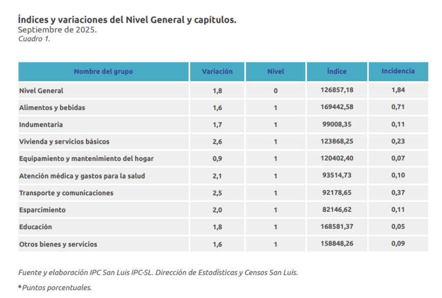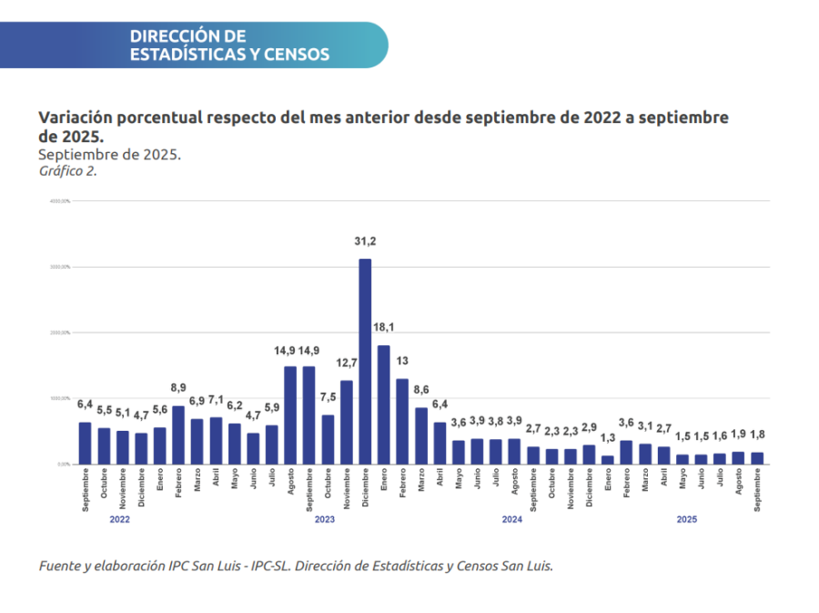 La dirección de Estadística y Censos presentó los resultados del informe de Índice de Precios al Consumidor (IPC) correspondiente al mes de septiembre de 2025. Los datos reflejan una variación del 1,8%, acumulando un 20,7% en lo que va del año y un 30% interanual, es decir desde septiembre de 2024.