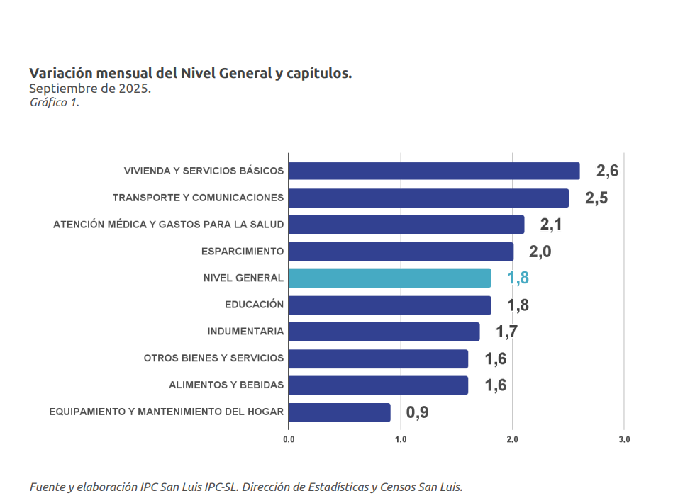 El capítulo con mayor incremento fue ‘Vivienda y servicios básicos’ con un 2,6%, acumulando un 36,2% durante el 2025 y un 59,9% con respecto a septiembre del año 2024. Las principales subas en este capítulo fueron registradas en ‘Alquiler de la vivienda’, ‘Combustibles para la vivienda’, ‘Materiales y mano de obra para reparaciones’, entre otros.