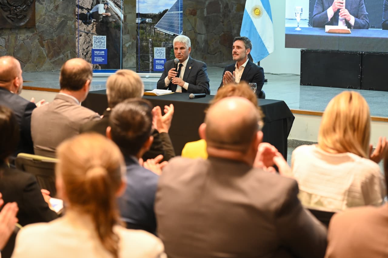 El acto contó también con la participación del ministro de Desarrollo Productivo, Federico Trombotto; la secretaria de Vinculación Interjurisdiccional, Gabriela González Riollo; la coordinadora de la Unidad Ejecutora Provincial, María Eugenia Vergés; y autoridades de San Luis Agua, la Comisión Reguladora de Energía Eléctrica, y otras áreas técnicas de la Provincia.