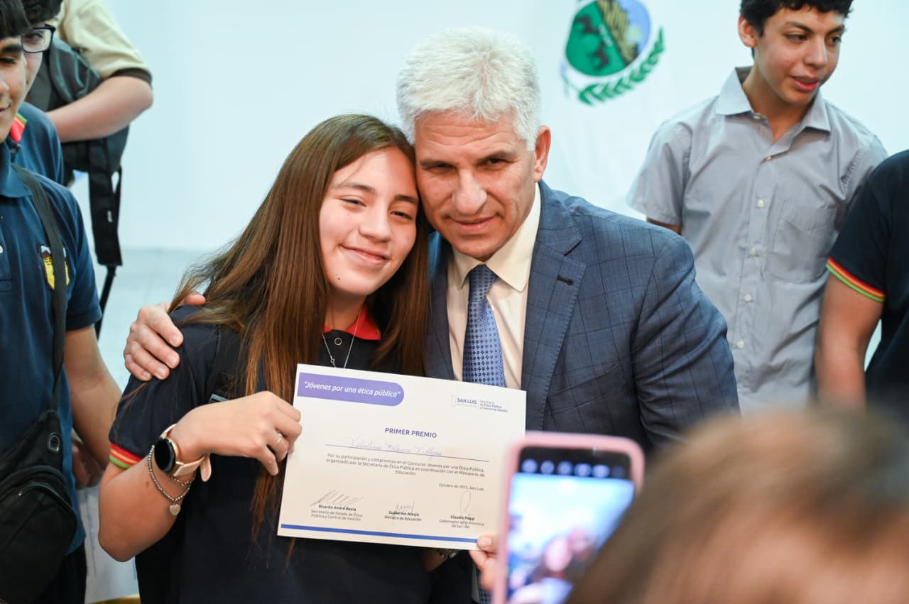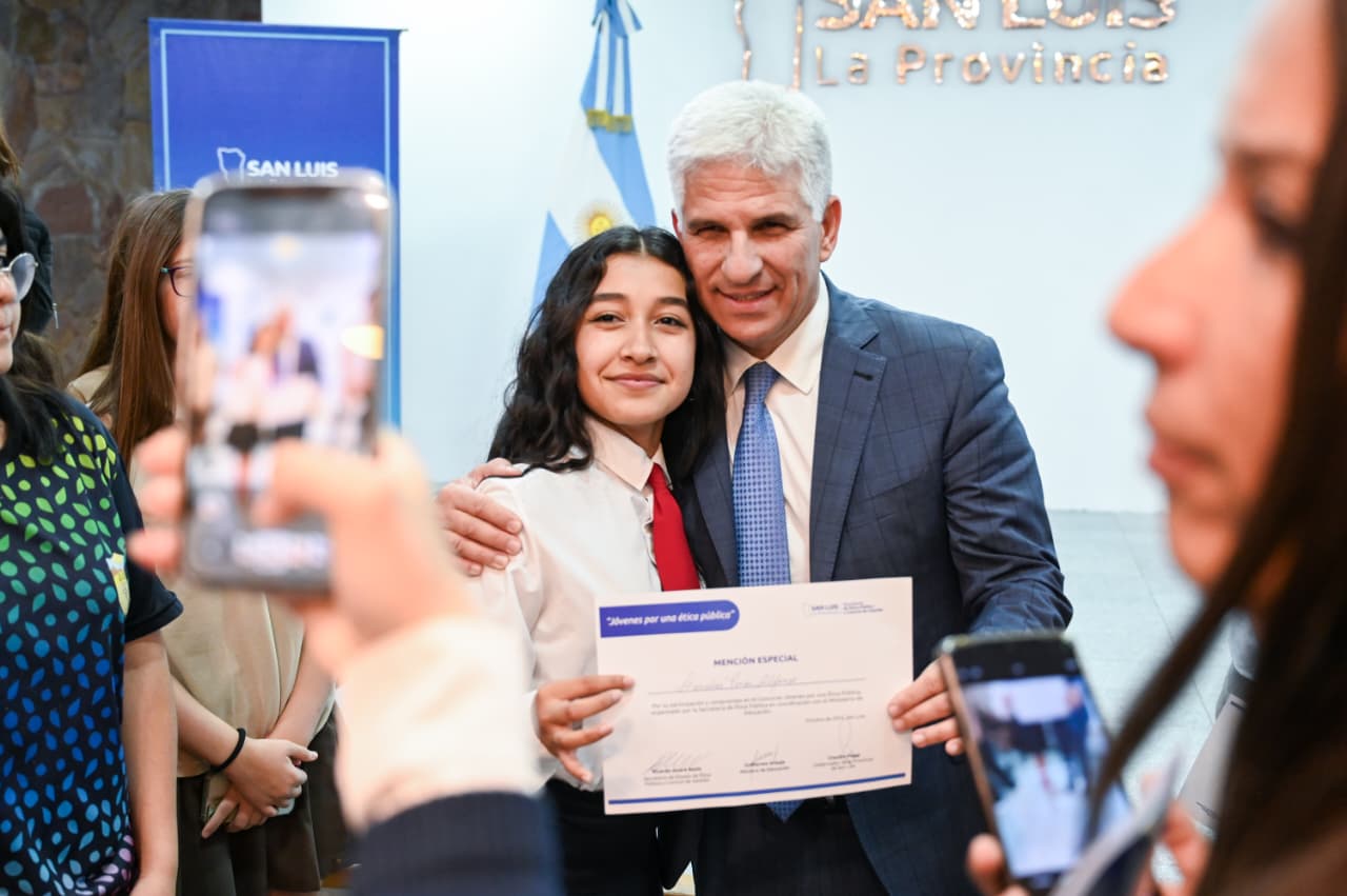 Este miércoles, el Salón Blanco de Casa de Gobierno se vio colmado por un centenar de estudiantes de cuatro escuelas de San Luis, Juana Koslay y Villa Mercedes que fueron premiados en el concurso ‘Jóvenes por una Ética Pública’. El certamen, organizado por la secretaría de ética Pública y Control de Gestión, buscó crear un espacio de reflexión sobre el uso de las redes sociales, la inteligencia artificial y los valores éticos para fomentar un pensamiento crítico y creativo. Para celebrar sus logros, el gobernador Claudio Poggi los agasajó con un desayuno.