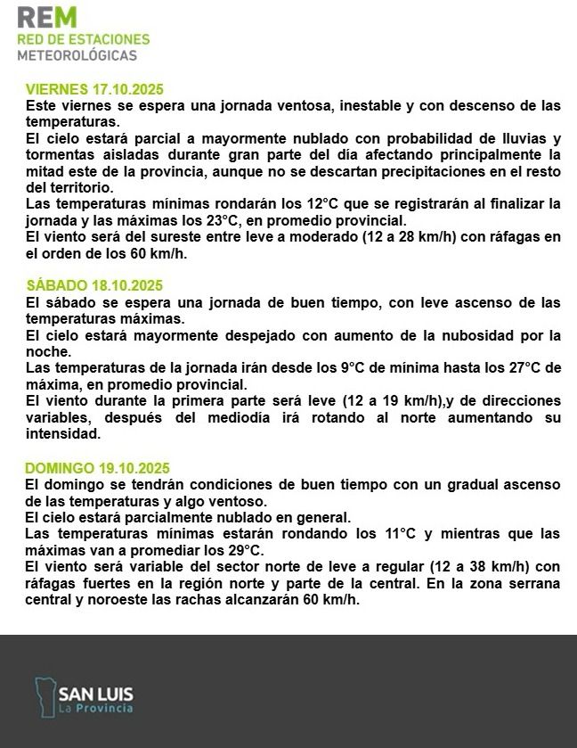 La Red de Estaciones Meteorológicas (REM) anunció que este sábado se espera una jornada agradable con un leve ascenso de las temperaturas máximas, marcando mínimas de 9ºC y alcanzando máximas de 27ºC. Por su parte, luego del mediodía, el viento aumentará su intensidad y rotará hacia el norte con una velocidad máxima de 28 kilómetros por hora.