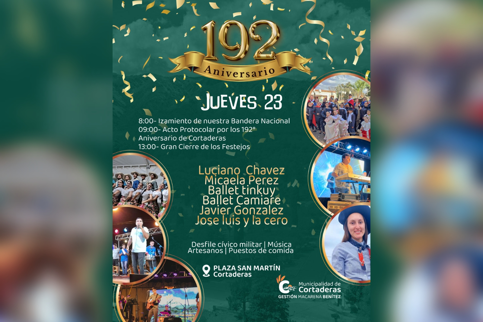 Debido al inminente 192° aniversario de la localidad de Cortaderas, el Municipio organizó una serie de actividades pensadas para el disfrute de toda la comunidad. Los festejos comenzaron el lunes 20 y se extenderán hasta el jueves 23 de octubre, fecha en la cual se conmemora el cumpleaños del pueblo.