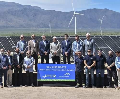 El proyecto, impulsado por las empresas PCR y ArcelorMittal Acindar, combina tecnología solar y eólica en un mismo lugar con 25 aerogeneradores y 35.000 paneles solares. Con esta inauguración, el complejo alcanzó 130 mega watts de potencia instalada, capaz de generar energía para 250.000 viviendas de distintos puntos del país, y se convirtió en el primer parque híbrido de generación renovable del país.