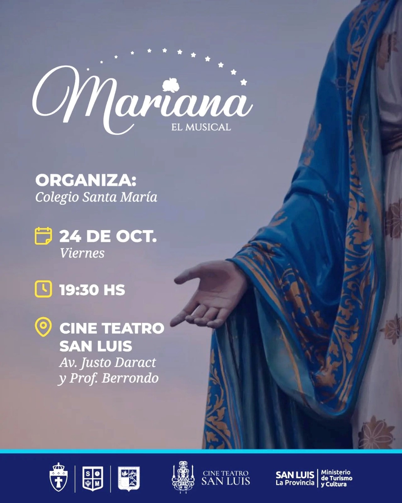 Más de 250 personas en escena. Participan alumnos del Colegio Santa María, desde sala de 3 hasta exalumnos, docentes y colaboradores que se unen para traer al teatro la vida y devoción de María en un formato de musical conmovedor.