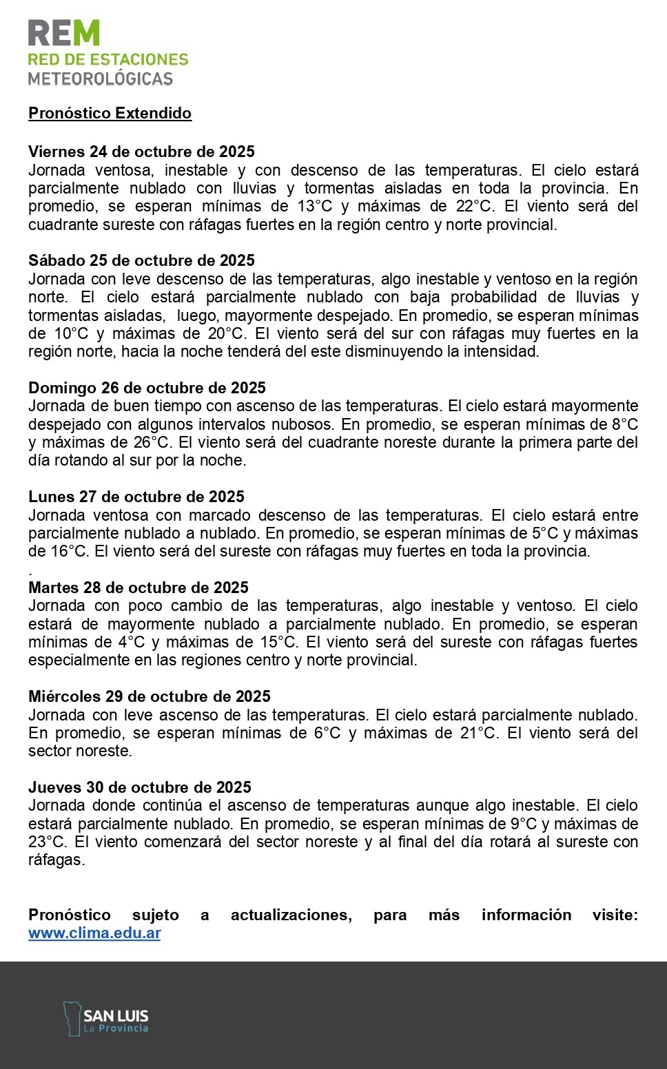 “El cielo estará parcial a mayormente nublado con probabilidad de lluvias y tormentas aisladas durante gran parte del día, afectando primero el sur de la provincia durante la mañana y luego se irá extendiendo al resto del territorio, especialmente por la noche”. “Las temperaturas mínimas rondarán los 15° y las máximas los 31°, en promedio provincial”, informó el organismo.