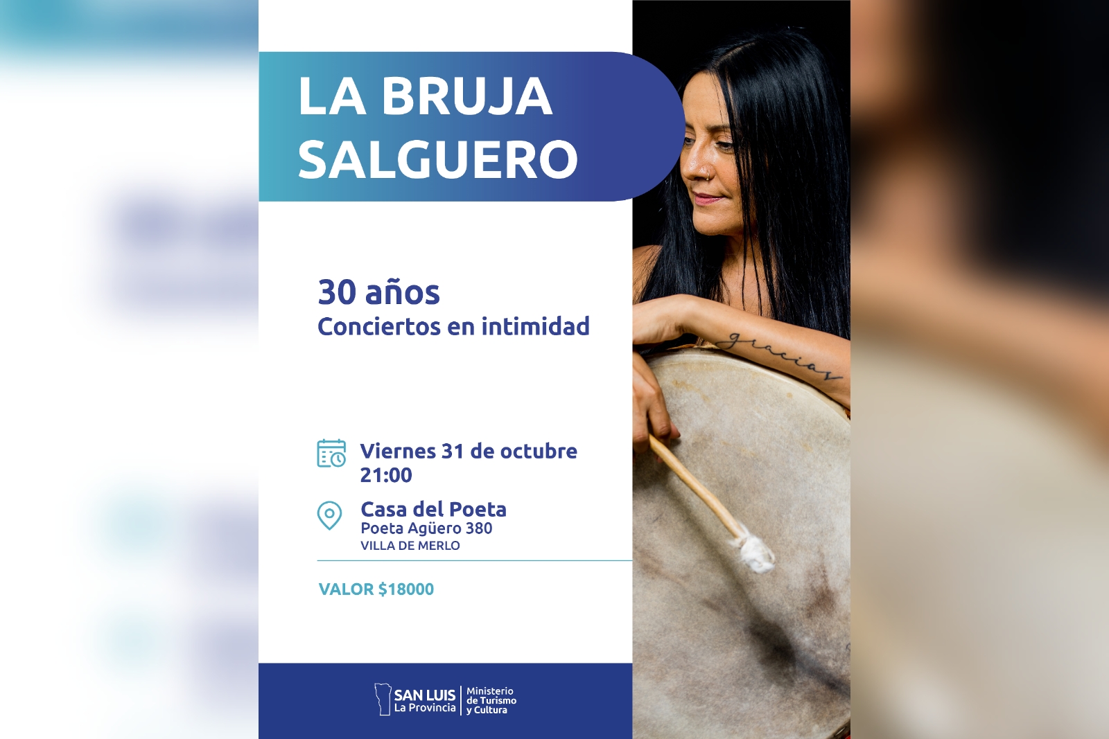 La destacada artista conocida como ‘La Bruja’ Salguero regresará a la Villa de Merlo para un encuentro especial con el público de la región. Este viernes 31 de octubre, a las 21:00, la talentosa cantante riojana se presentará por primera vez en el auditorio de la Casa del Poeta ‘Antonio Esteban Agüero’ con su espectáculo ‘30 años, conciertos en intimidad’.