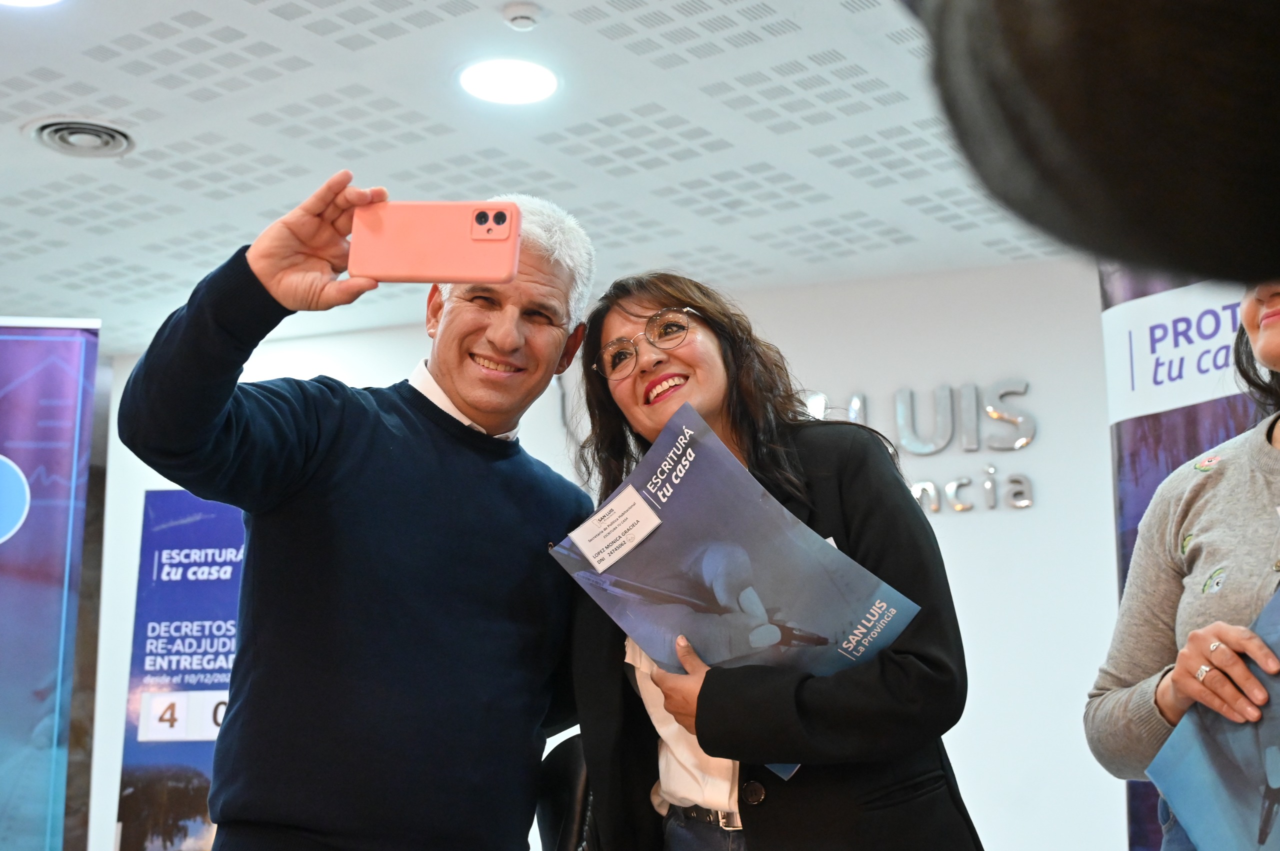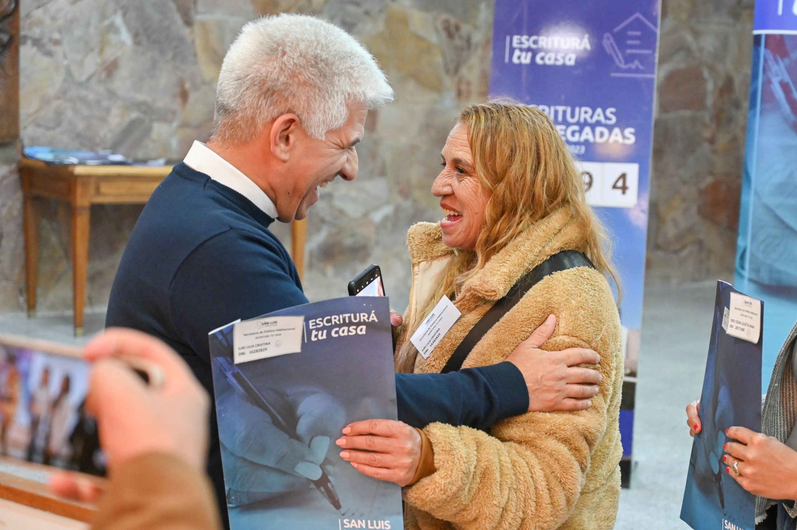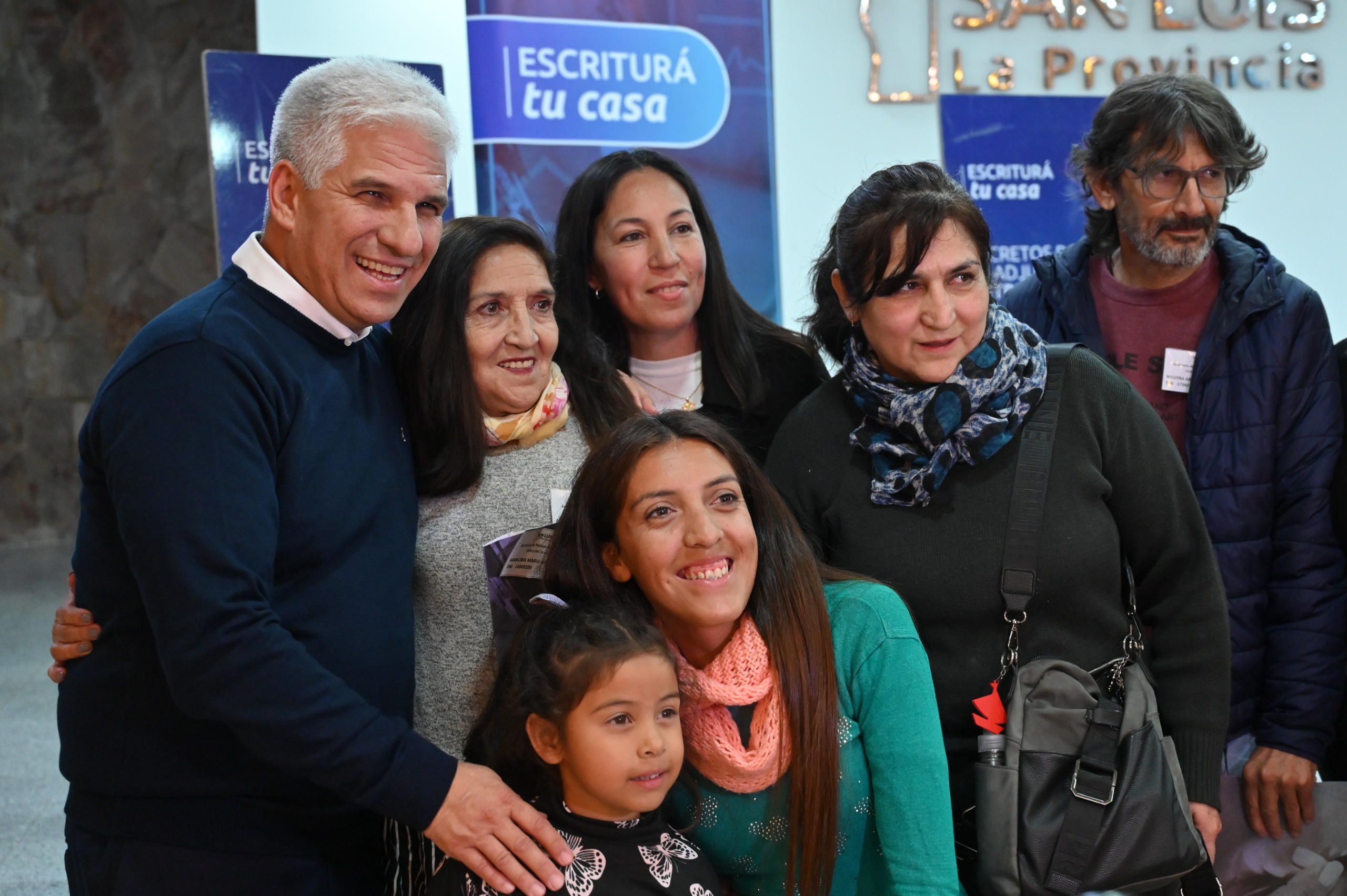 Este lunes por la tarde, el Salón Blanco de Casa de Gobierno se llenó de alegría, emoción y orgullo. Más de 100 familias de la Capital, La Punta, Juana Koslay, El Volcán, La Carolina y Balde recibieron de la mano del gobernador Claudio Poggi el documento que los habilita a decir: “Soy dueño de mi casa”.