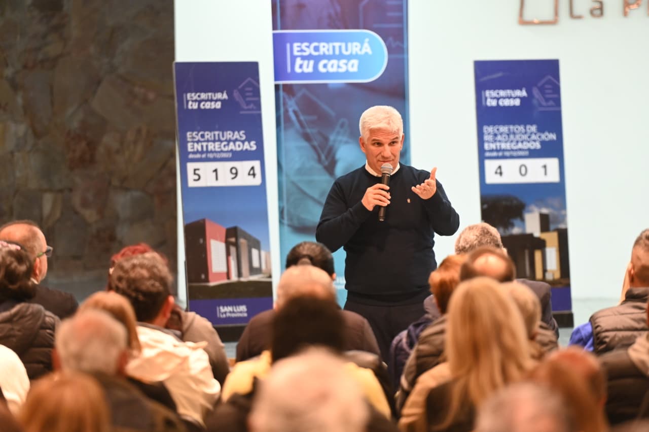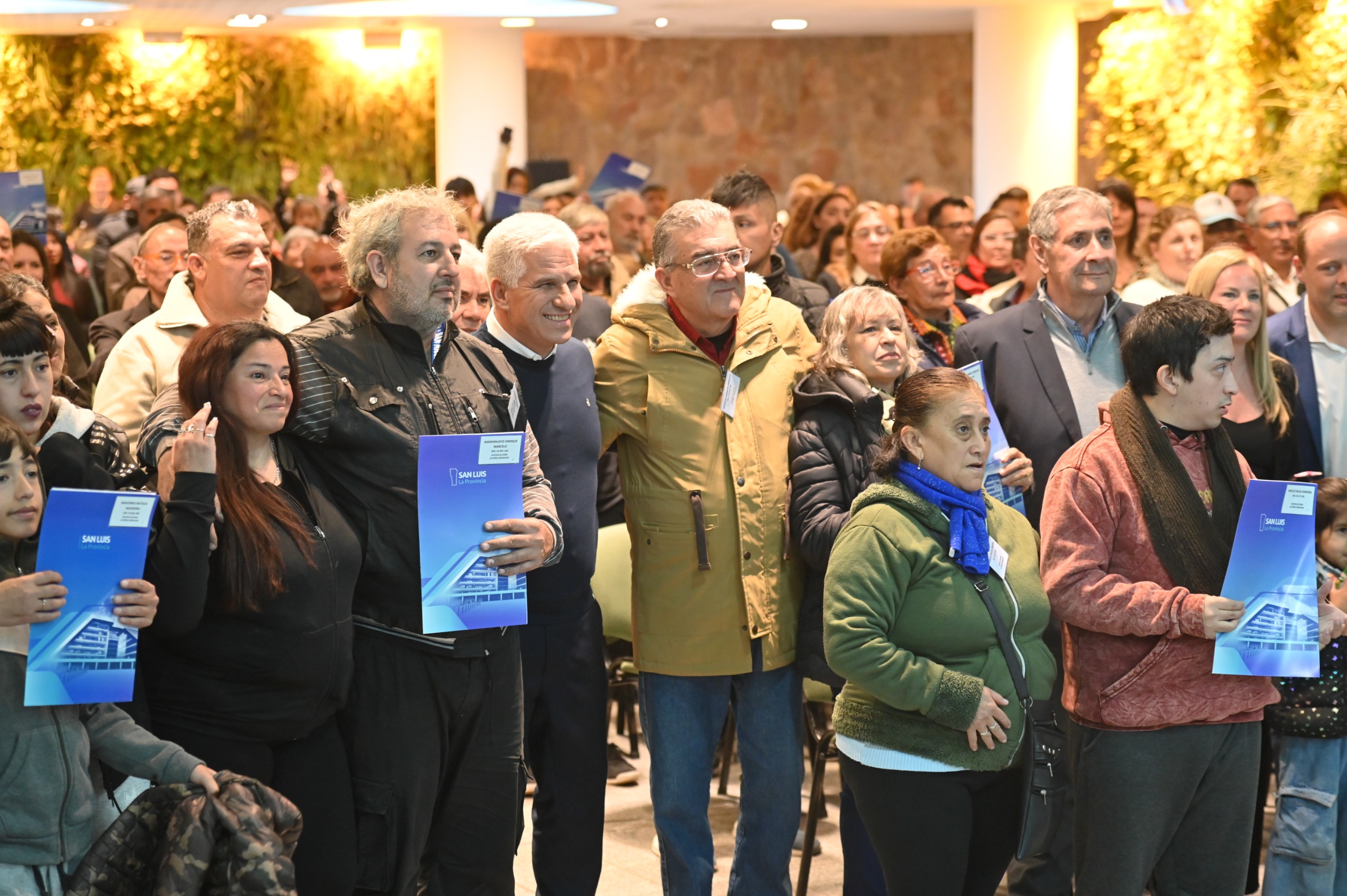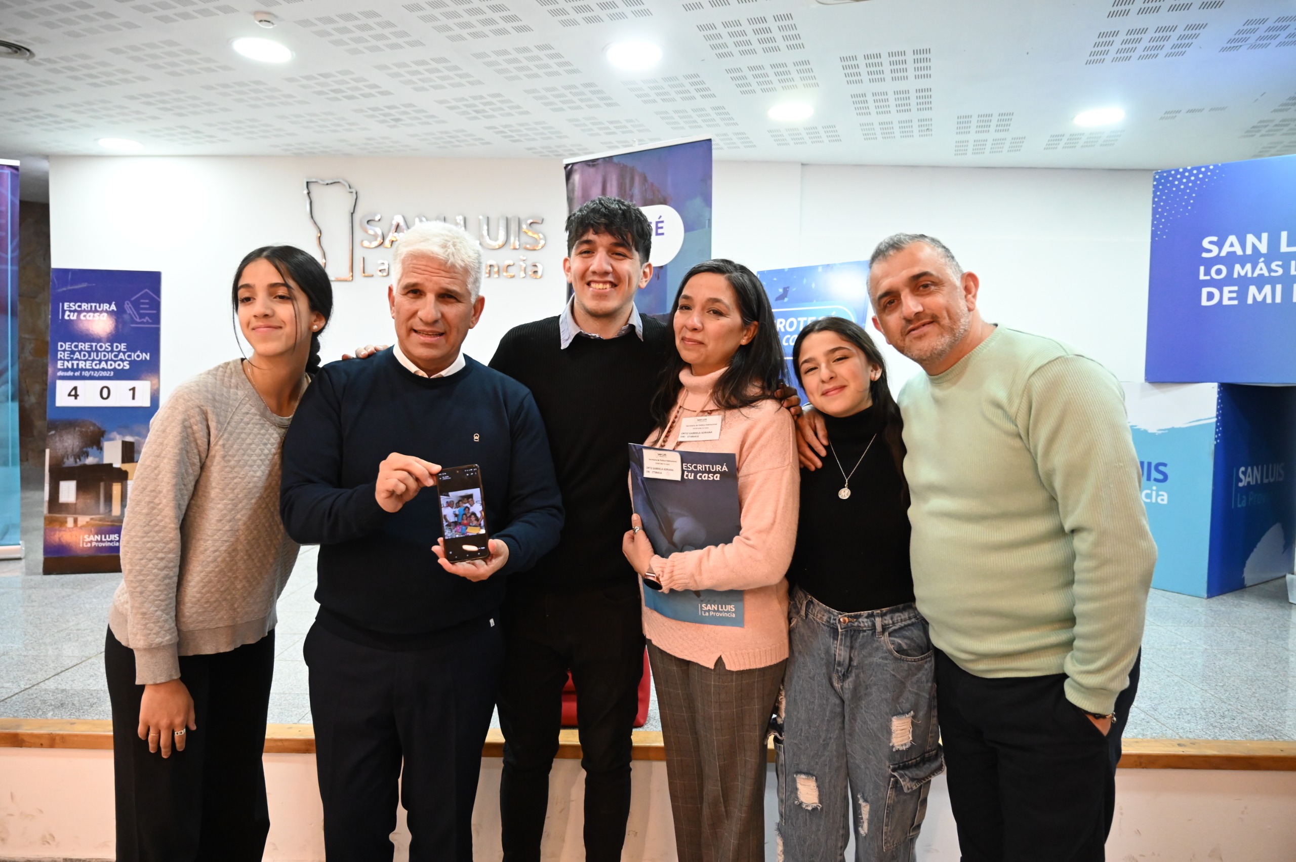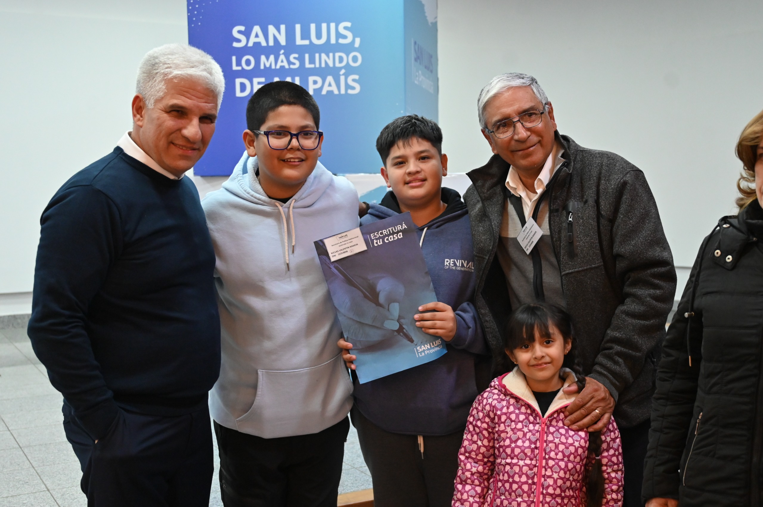 Este lunes por la tarde, el Salón Blanco de Casa de Gobierno se llenó de alegría, emoción y orgullo. Más de 100 familias de la Capital, La Punta, Juana Koslay, El Volcán, La Carolina y Balde recibieron de la mano del gobernador Claudio Poggi el documento que los habilita a decir: “Soy dueño de mi casa”.