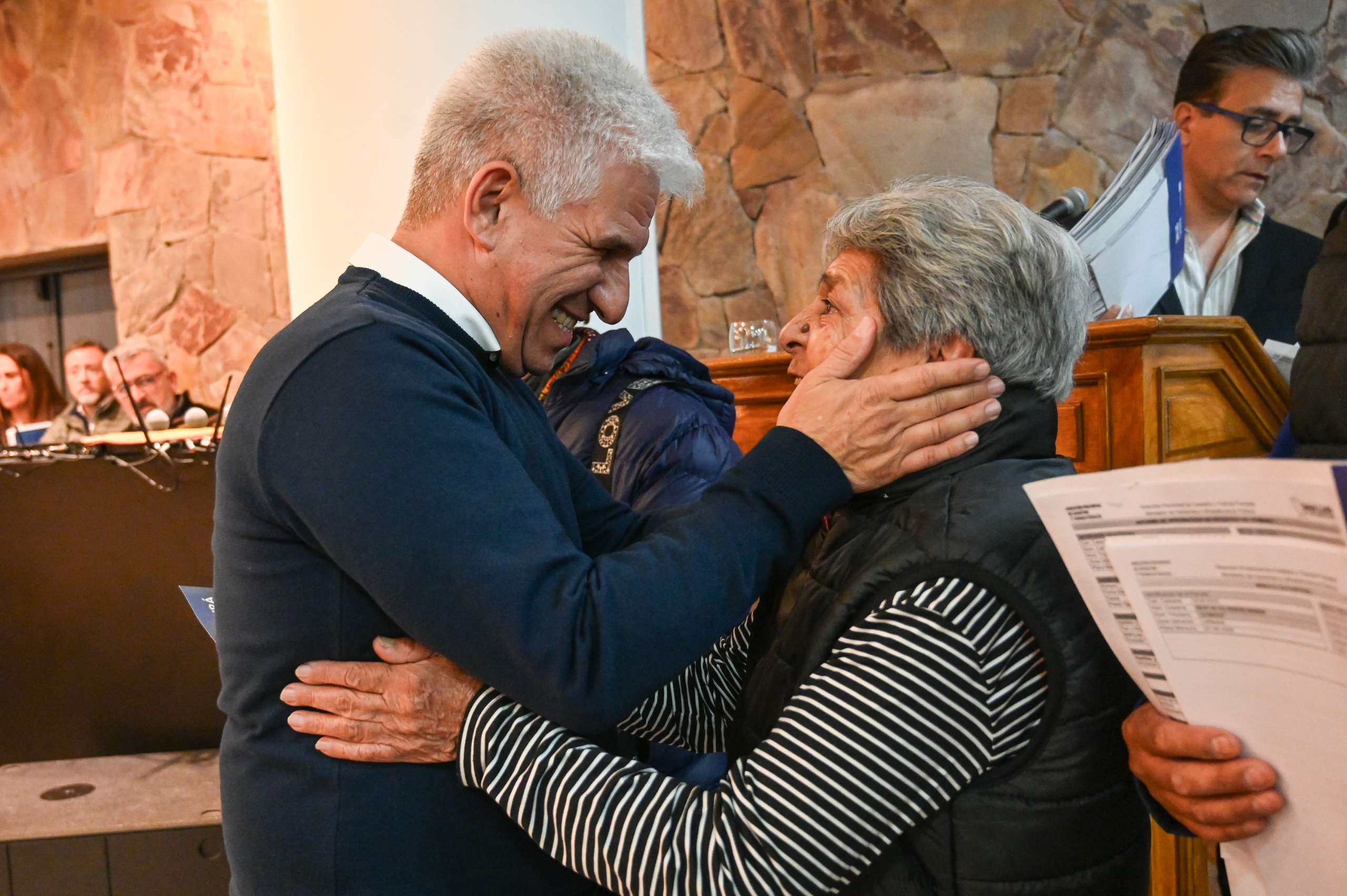 Rosa María Garraza tiene 73 años y es vecina del barrio José Hernández. Vive allí desde que se casó y, tras su divorcio, temía perder su hogar. En esa casa crecieron sus tres hijos, y con ellos, los recuerdos de toda una vida. Esta tarde de lunes, después de 30 años de espera, finalmente recibió la escritura de su vivienda. “Estoy muy contenta, esperé muchos años”, contó emocionada.