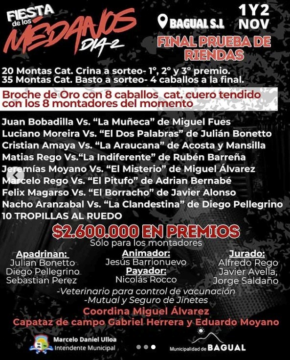 El domingo 2 de noviembre, el evento comenzará a las 09:00 y llevará adelante la final de prueba de riendas, jineteada, entrega de premios, servicio de cantina y la actuación de un payador.