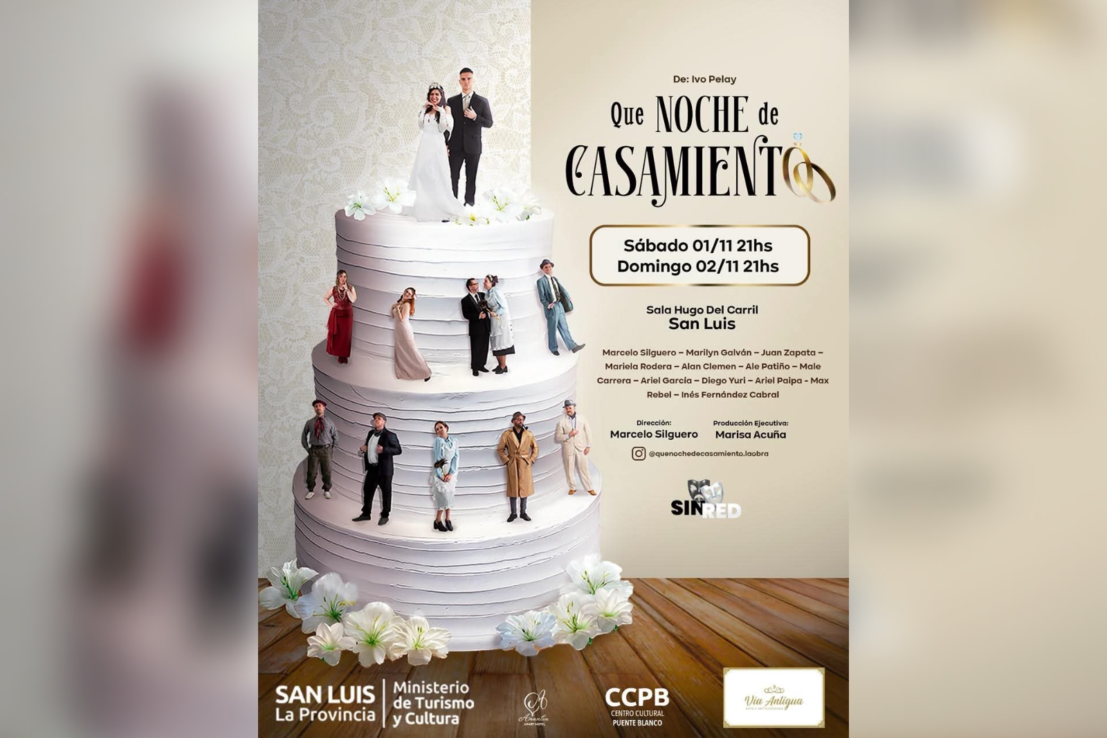 Este sábado 1° y domingo 2 de noviembre, la obra ‘Qué noche de casamiento’ se presentará en la sala Hugo del Carril a las 21:00. Con autoría de Ivo Pelay, esta pieza teatral promete enredos, humor familiar y risas a carcajadas.