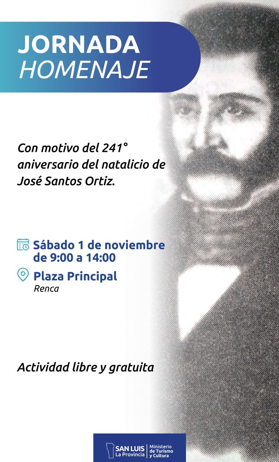 En la localidad de Renca, este sábado 1° de noviembre en la plaza principal de 9:00 a 14:00, las actividades comenzarán con la recepción de autoridades en la Casa de Los Gobernadores, para continuar con el acto protocolar. Posteriormente se realizarán conferencias, disertaciones, conversatorios y un recorrido por la vida de José Santos Ortiz. Se descubrirá el busto en el sepulcro de Santos Ortiz y se realizará la entrega de una ofrenda floral.