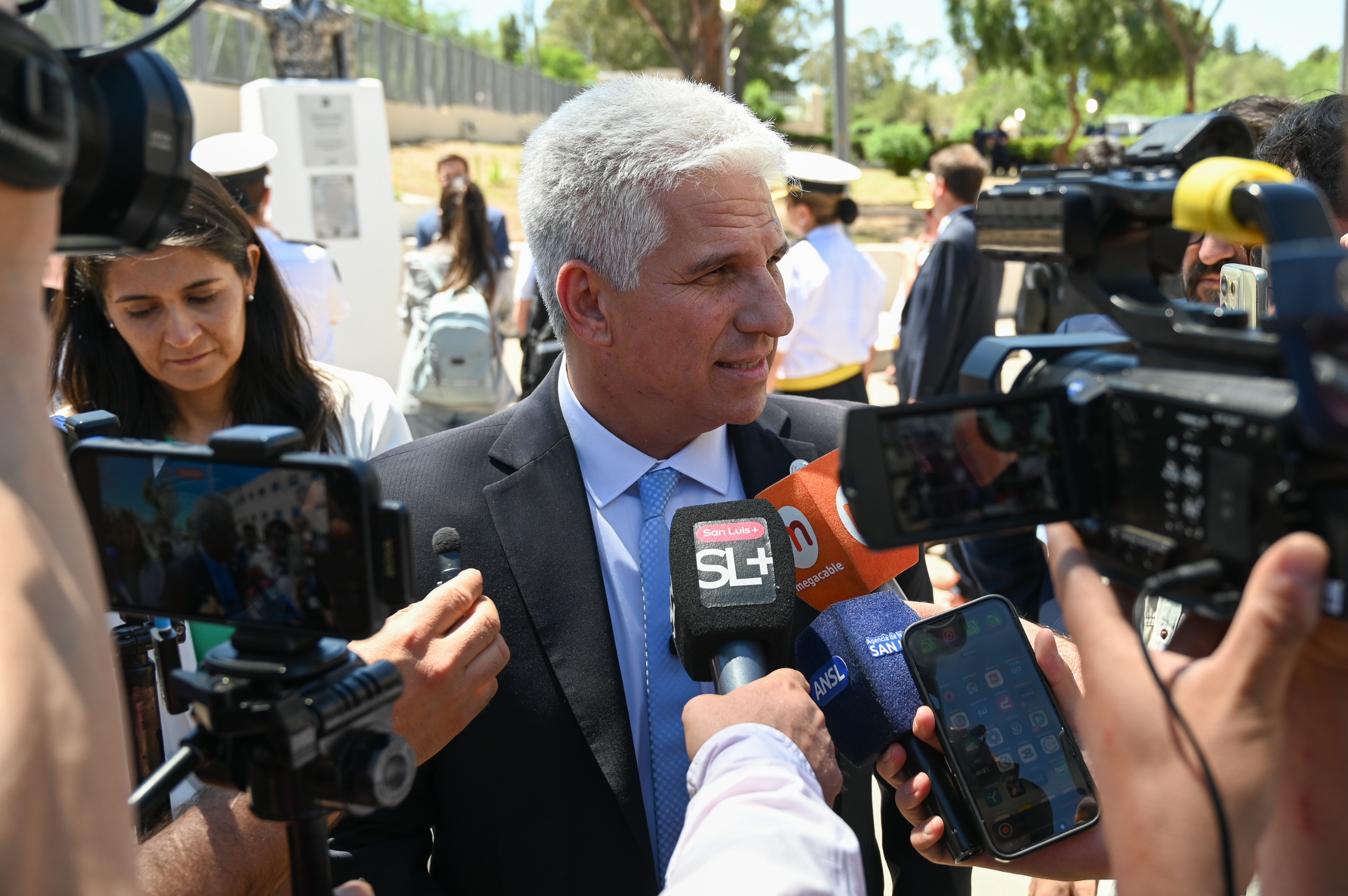 “Mi presencia aquí, por segundo año consecutivo, y en mi otra gestión todos los años, cada 31 de octubre, es una muestra de respeto a la institución y de respaldo a su personal, a los agentes de seguridad, en el marco de la ley y la Constitución, brindando todo el respaldo del Gobierno de la Provincia”, dijo el gobernador Claudio Poggi ante la prensa luego de encabezar el acto por el 167° aniversario de la Policía de San Luis.