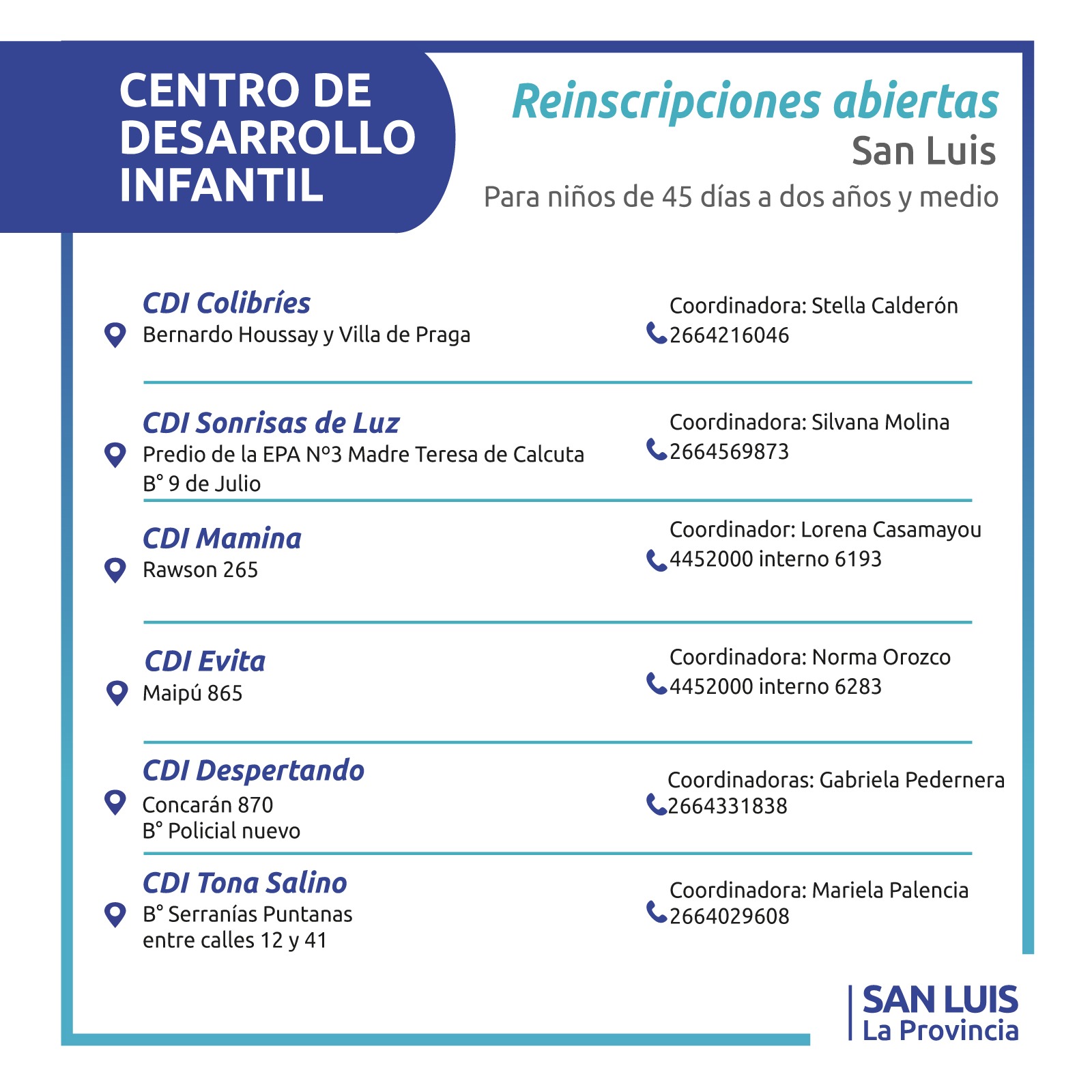 Son establecimientos de contención donde se recibe y atiende a niños y niñas desde los 45 días de vida a los 2 años y medio. Brindan un ambiente propicio de cuidado, confianza y seguridad, promoviendo el desarrollo integral adecuado y sano del niño en su primera infancia. Están destinados a familias vulnerables y con recursos económicos mínimos. Existen actualmente 22 CDI distribuidos en la ciudad de San Luis, Villa Mercedes, La Punta, Cortaderas, Renca y Candelaria