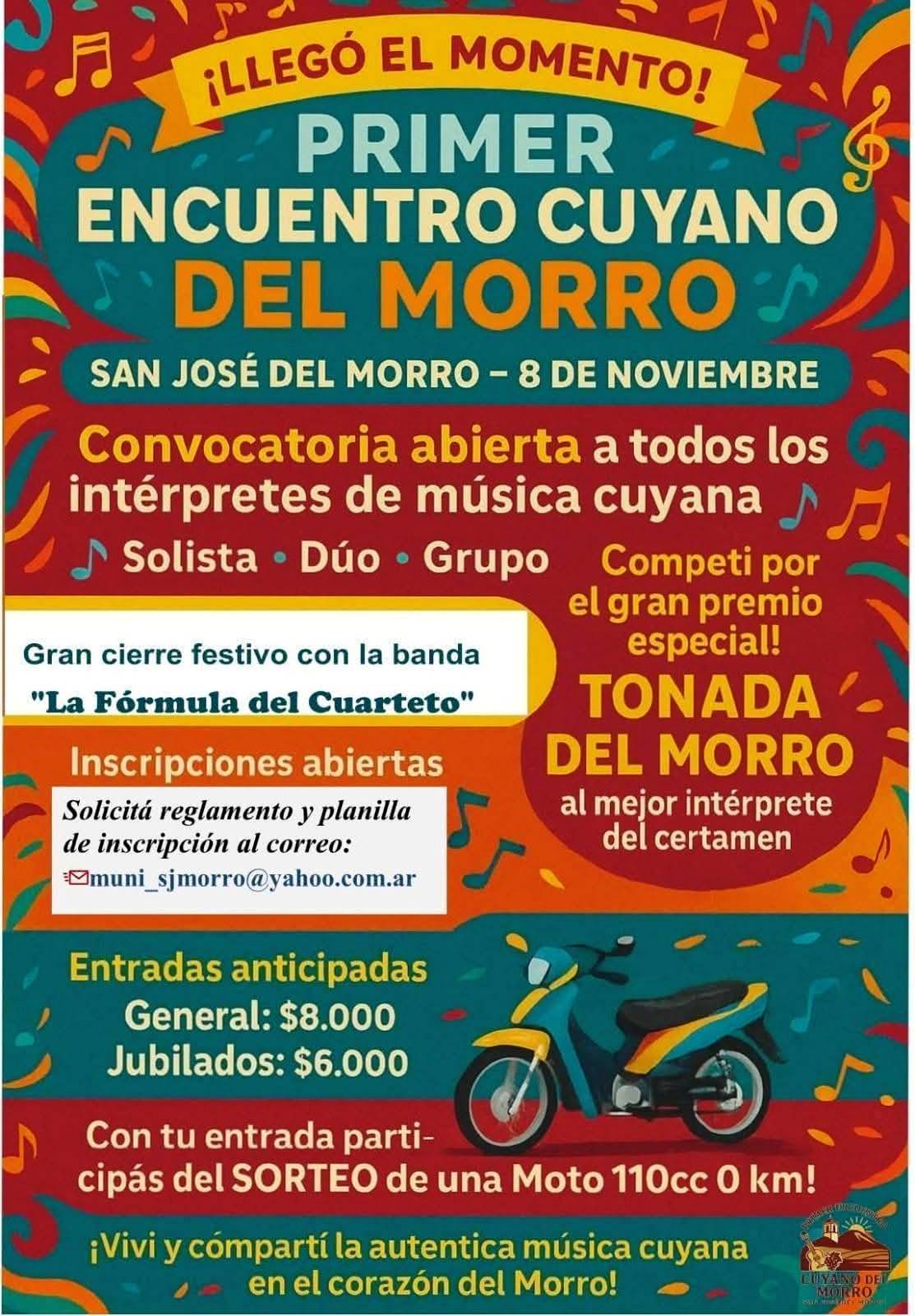 Este sábado 8 de noviembre, el Polideportivo Municipal de la localidad de San José del Morro, será escenario del Primer Encuentro Cuyano del Morro, una celebración del folclore cuyano, que tiene por objetivo fortalecer este género, promover talentos y que el pueblo se consolide como referente cultural. Los artistas emergentes podrán participar del certamen ‘Tonada de Morro’. Se entregarán $1.800.000 en premios y entre el público se sorteará una moto.