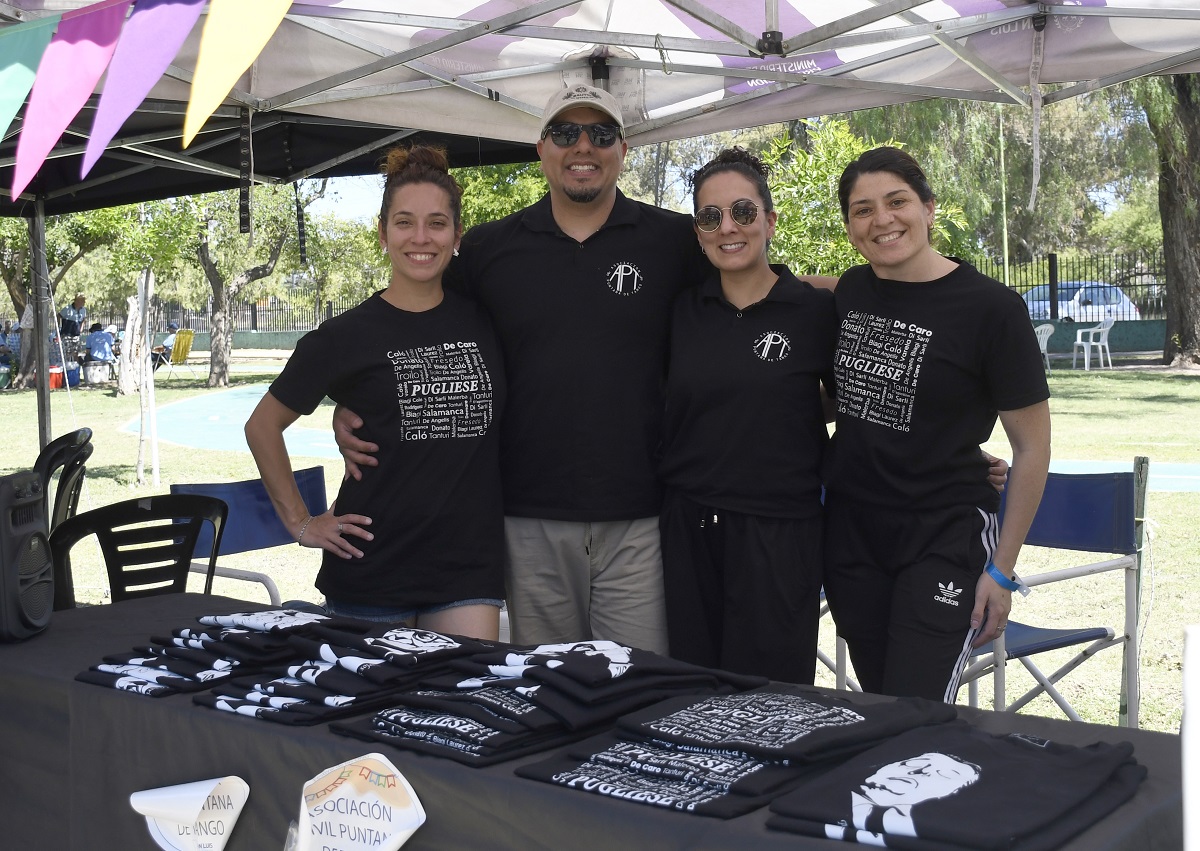 Damián Zuñiga, representante de la Asociación Puntana de Tango, destacó la importancia de participar en este tipo de encuentros. “Para nosotros es un honor que siempre nos convoquen, nos inviten”, expresó mientras la organización vendía remeras y se preparaba para mostrar pasos de tango.