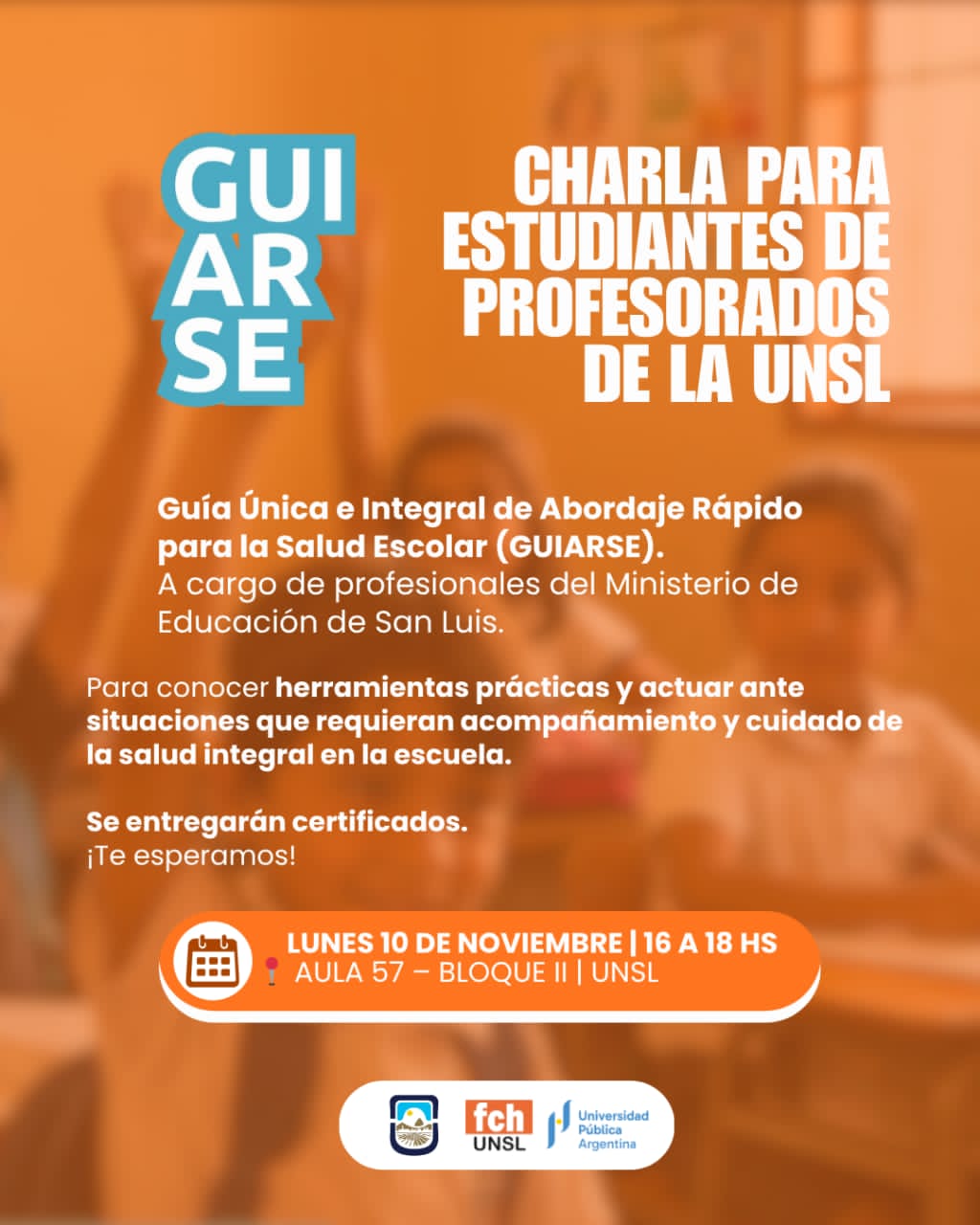 En la Universidad Nacional de San Luis (UNSL) se brindará una charla sobre la Guía Única e Integral de Abordaje Rápido para la Salud Escolar (Guiarse), dirigida a estudiantes de profesorados de la referida casa de altos estudios. Será el lunes 10 de noviembre, de 16:00 a 18:00, en el aula 57 del bloque II. La participación es libre y gratuita y se entregarán certificados de asistencia.