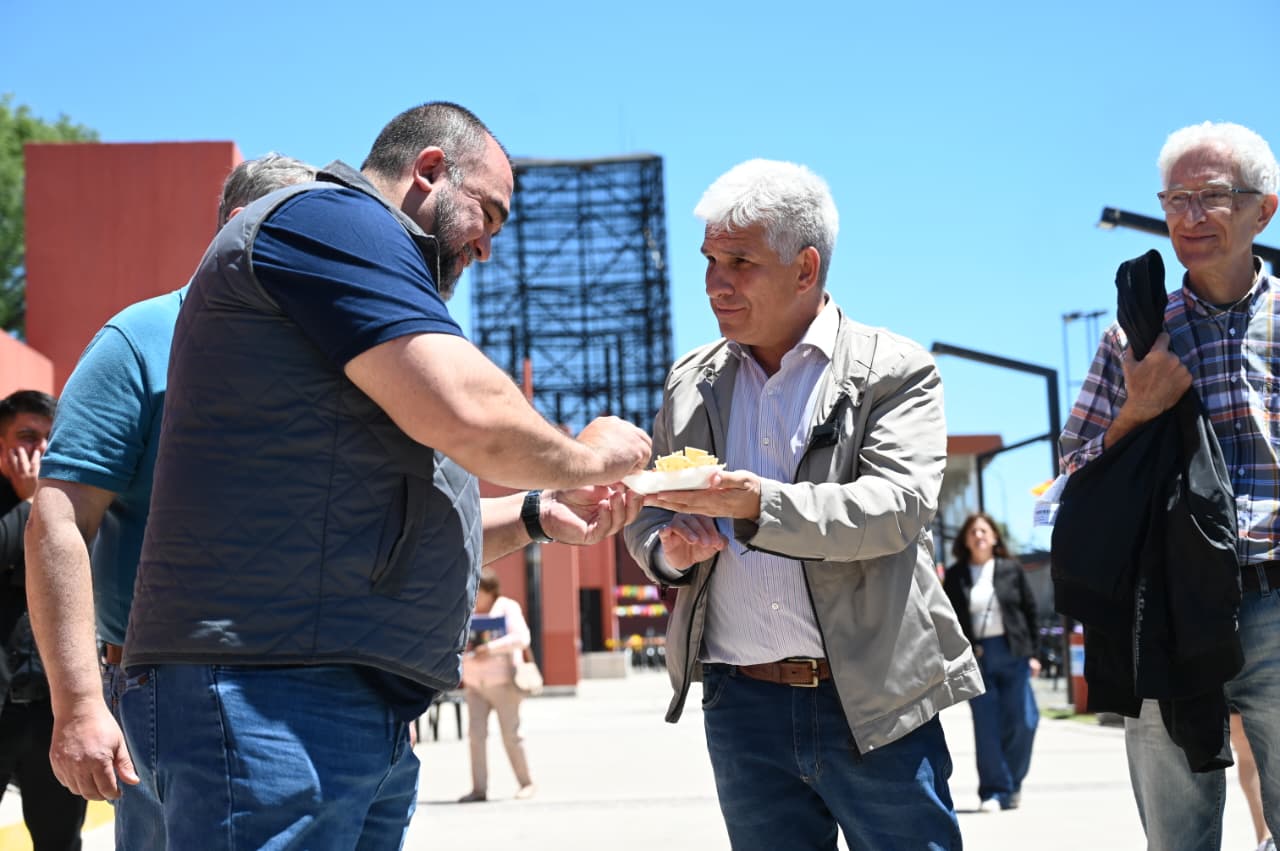 Durante su recorrida, Poggi dialogó con los organizadores y con los representantes de las colectividades presentes, quienes ultimaban detalles gastronómicos y decorativos. También saludó a vecinos que paseaban temprano por el complejo, compartiendo con ellos un momento de distensión y cercanía.