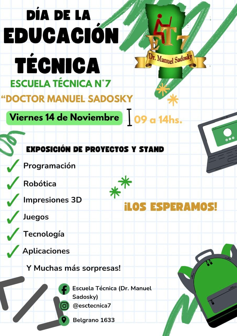 La Escuela Técnica Nº7 ‘Dr. Manuel Sadosky’ celebrará el Día de la Educación Técnica con una gran exhibición interactiva de trabajos realizados por sus estudiantes. La cita es este viernes 14 de noviembre, de 9:00 a 14:00, en su edificio ubicado en Belgrano 1633 de ciudad de San Luis.