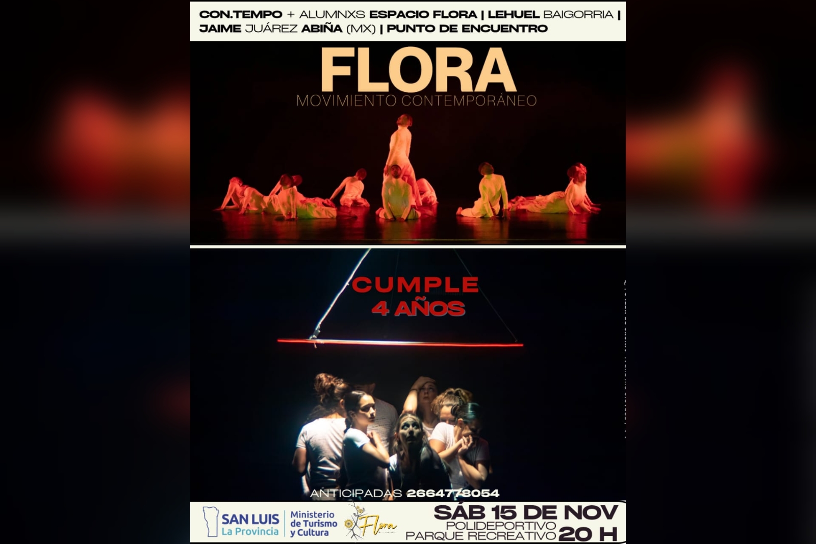 La compañía merlina ‘FLORA: Movimiento Contemporáneo’ celebrará su cuarto aniversario con una función especial este sábado 15 de noviembre, a las 20:00, en el Polideportivo del Parque Recreativo, ubicado en Barranca Colorada de la Villa de Merlo.