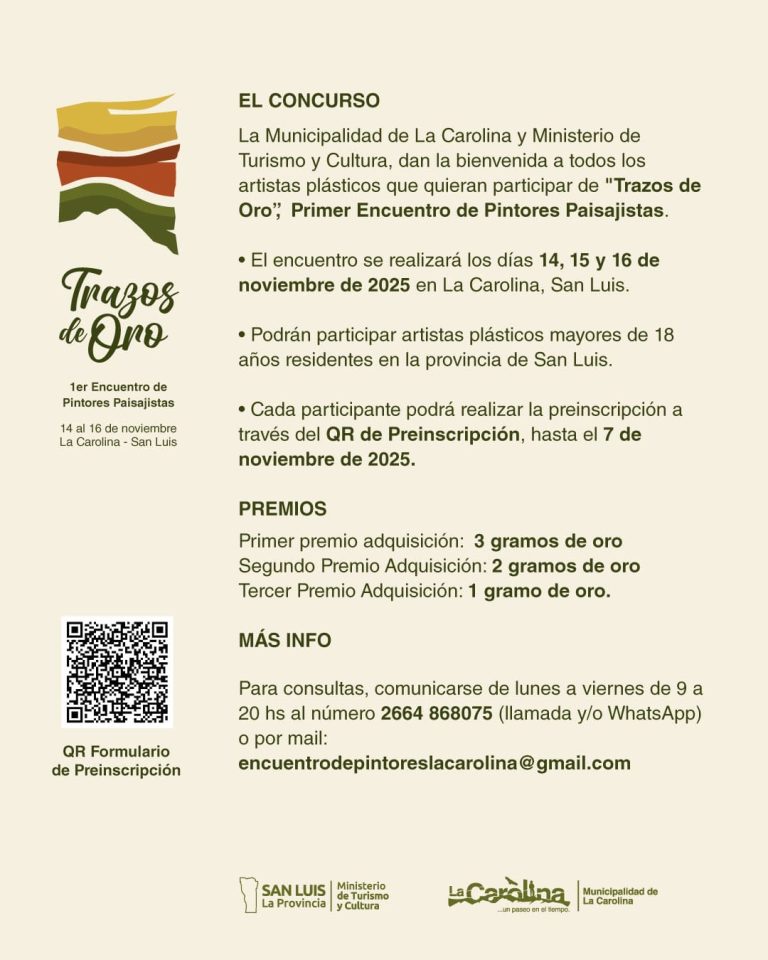 Además de la pintura en vivo, el encuentro incluirá muestras, charlas y recorridos guiados por los principales atractivos del pueblo, como la mina de oro, el Museo de la Poesía Manuscrita ‘Juan Crisóstomo Lafinur’ y la capilla de San Antonio de Padua, verdaderos símbolos de la historia local.