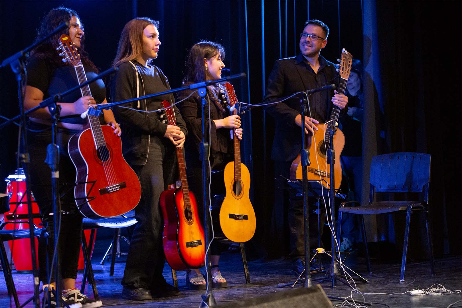 Natacha Leyes, alumna del taller de guitarra acústica a cargo del profesor Lucas Apendino, contó su experiencia: “Vengo de una familia que ama la música folclórica. Me llamó la atención y quise aprender a tocar la guitarra y hacer canciones de folclore. Hace días que venimos organizando esta presentación, y por suerte salió todo muy bien”.