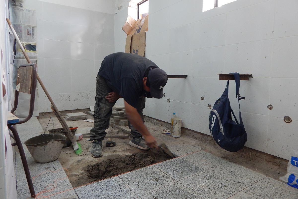 En la escuela ‘Pringles’ continúa la intervención en los baños exteriores con la colocación de pisos cerámicos, revestimientos y luminarias. En las próximas semanas se comenzará con la colocación de equipamiento y pintura. En el exterior se prepara la superficie para colocar la pintura.