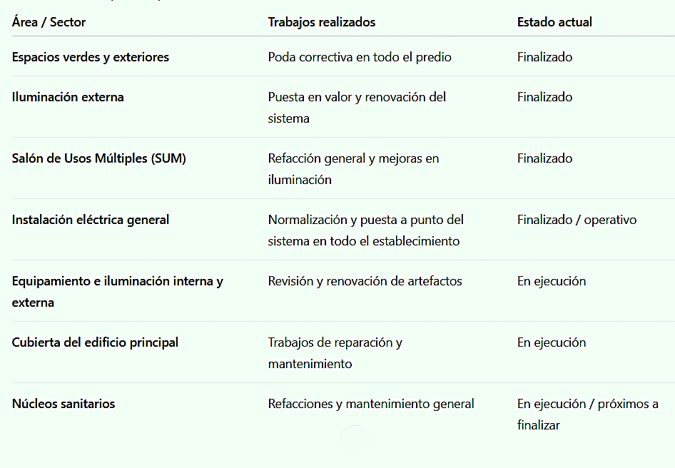 En el sector administrativo se renovará: dirección, cocina y sanitarios, incluyendo accesos y espacios adaptados para personas con discapacidad. Igualmente, se intervendrá el salón de usos múltiples y se hará la puesta a punto de instalaciones eléctricas, carpinterías, luminarias, vidrios y paneles de policarbonato dañados o faltantes.
