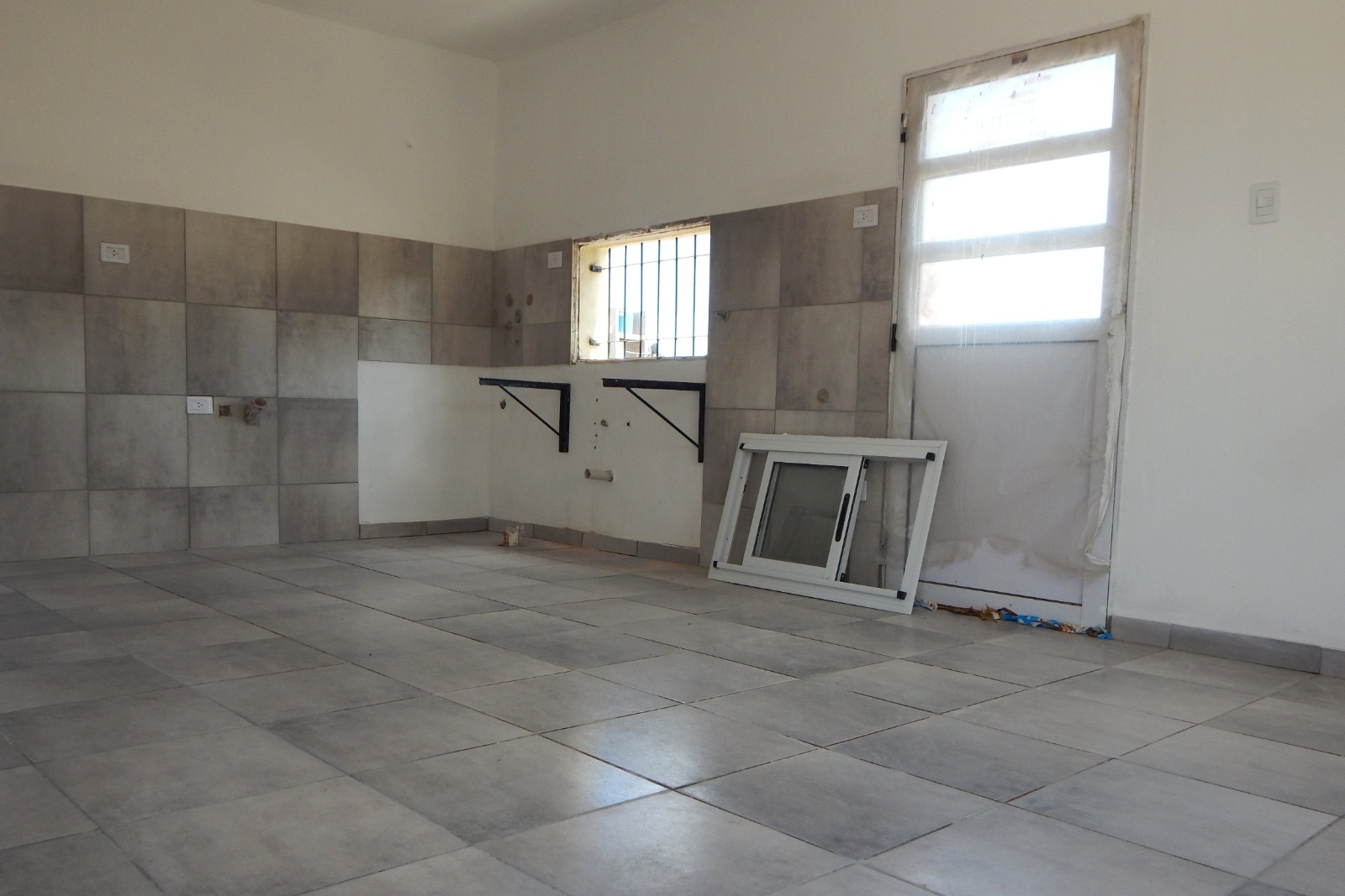 Las aberturas están colocadas con rejas y marcos terminados, así como luminarias externas ya instaladas. Los ambientes presentan pisos y revestimientos cerámicos finalizados, paredes pintadas y aberturas listas para su montaje. Las instalaciones eléctricas y sanitarias se encuentran aplicadas. Actualmente se realizan tareas finales de detalle y, en algunos casos, se completan los cerámicos en pisos y la instalación de mesadas en las cocinas.
