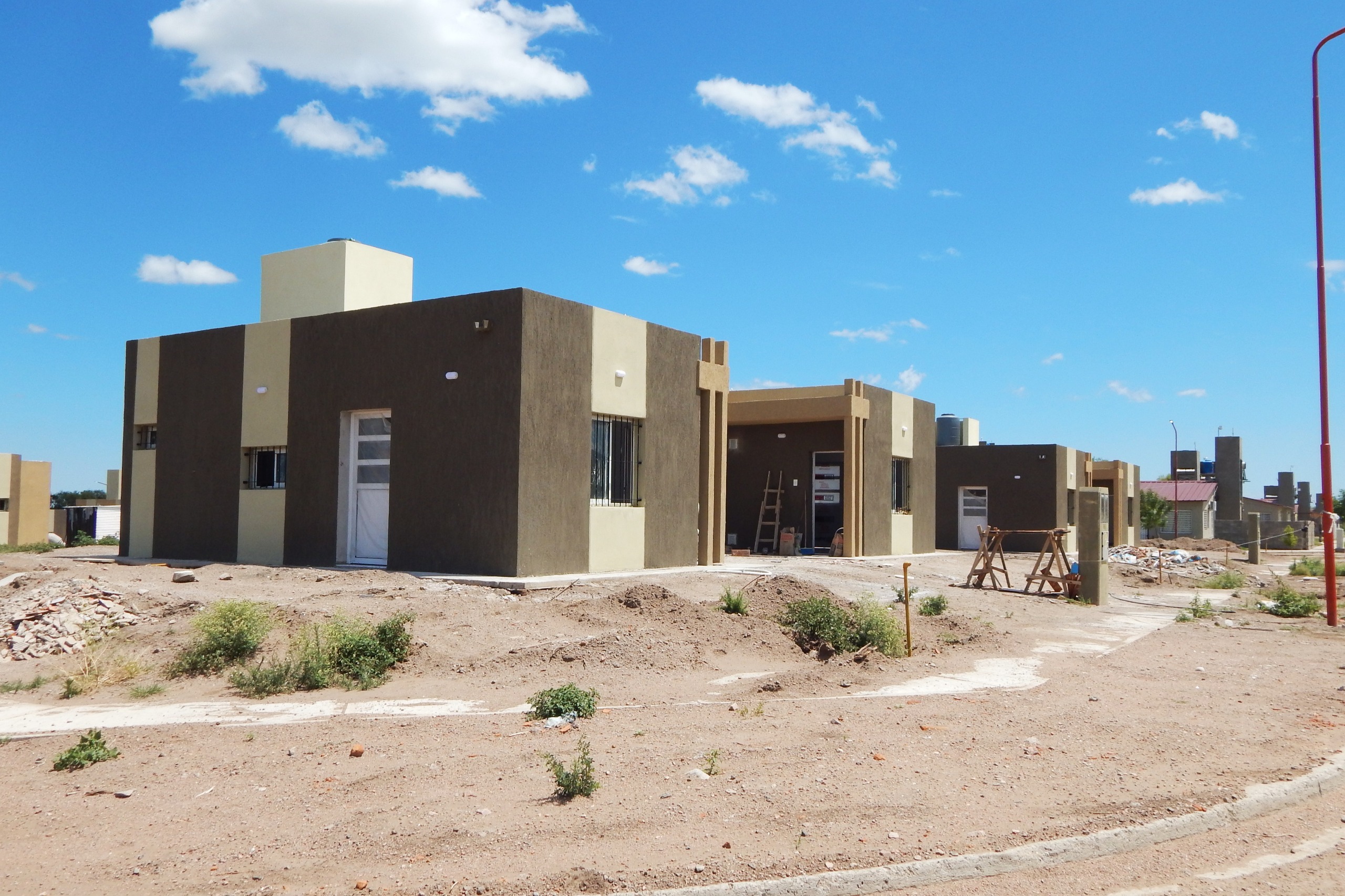 La dirección de Obras de Arquitectura y Viviendas detalló que las unidades corresponden a la terminalidad de los planes ‘Progreso’ y ‘Sueños’, y que presentan un alto grado de avance: las estructuras principales, techos y muros ya están concluidos, con revoques y pintura exterior aplicados en tonos beige y marrón.