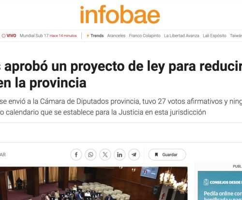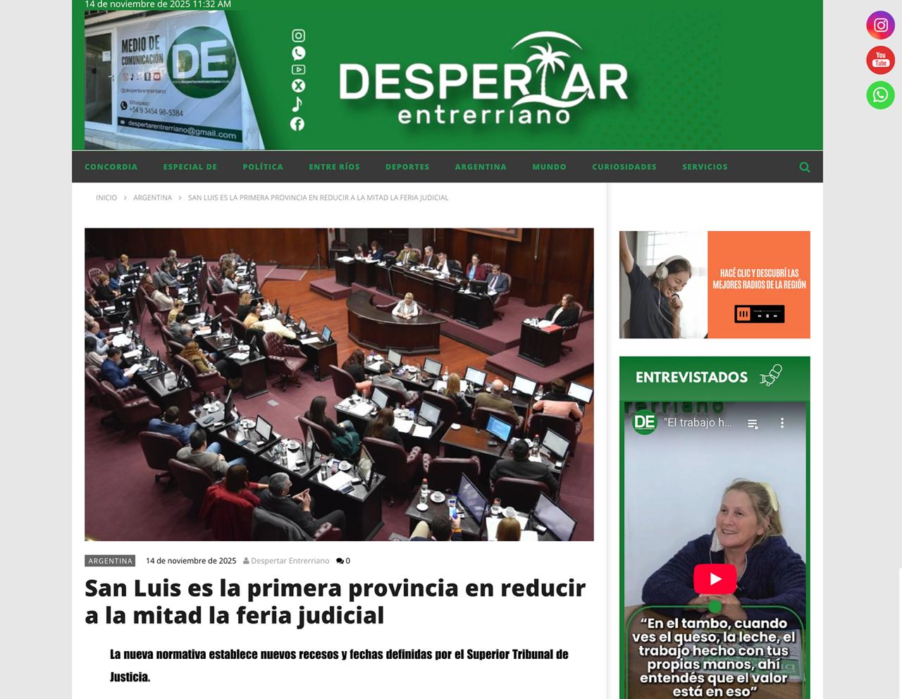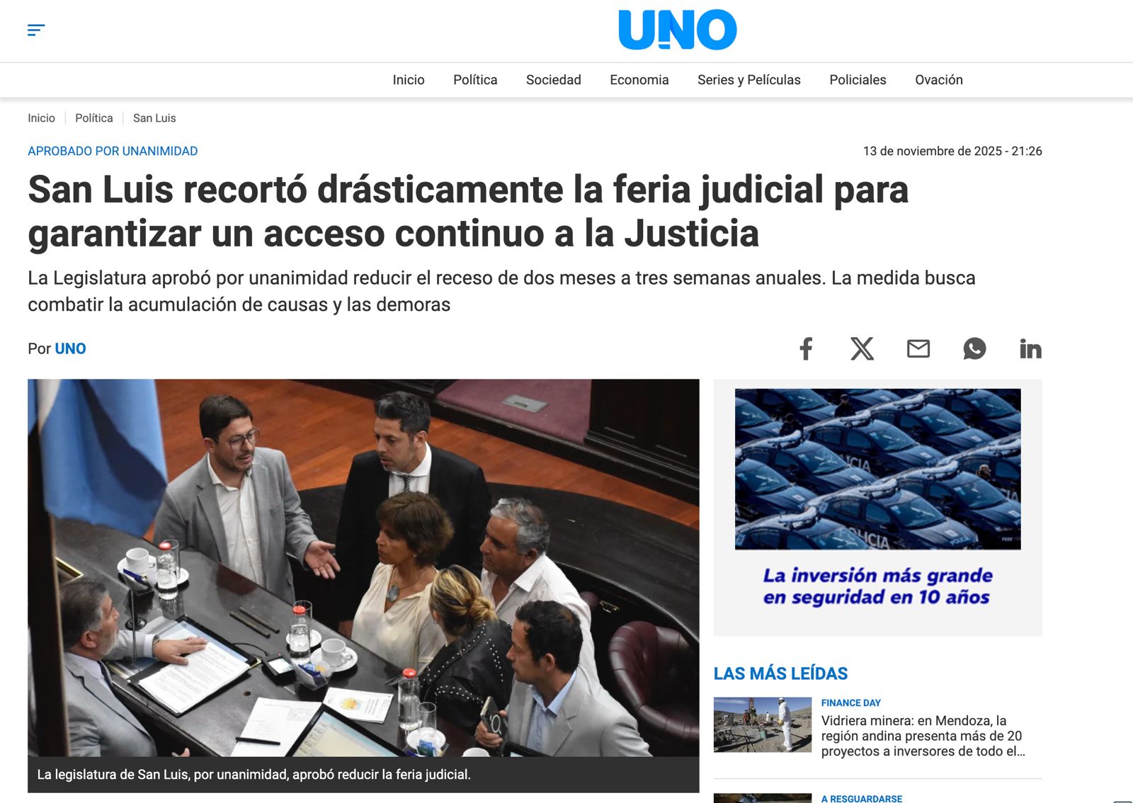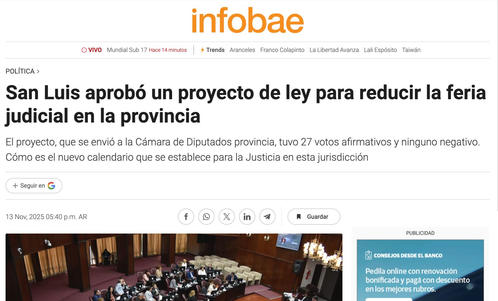 Infobae tituló: ‘San Luis aprobó un proyecto de ley para reducir la feria judicial en la provincia’. En el texto, destacaron: “Uno de los aspectos centrales del proyecto se vincula con el actual esquema de ferias y recesos, señalado por distintos sectores como un obstáculo para la eficacia y el acceso a la Justicia. Hasta ahora, los extensos períodos de paralización de la actividad judicial, sumados a la inactividad durante los fines de semana y los días considerados festivos, generaban acumulación de expedientes y demoras en la tramitación de causas”.
