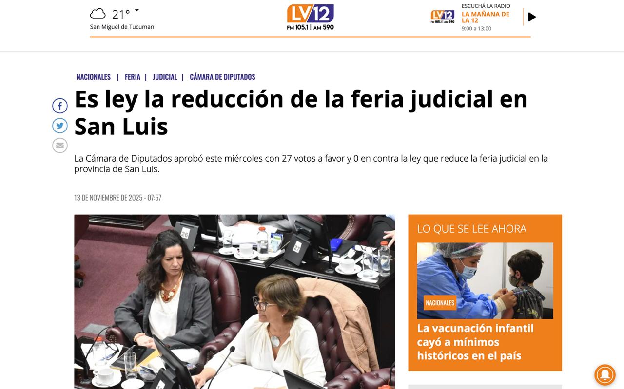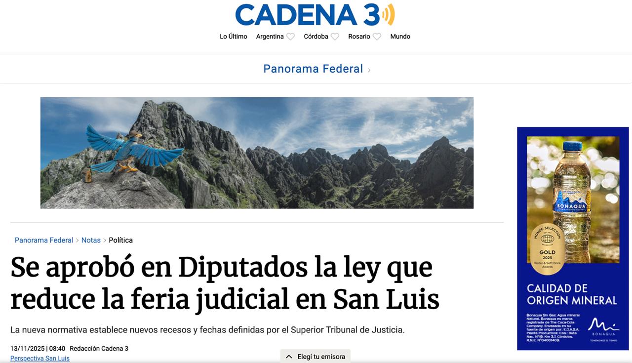 Un medio de una provincia vecina, Cadena 3, publicó: ‘Se aprobó en Diputados la ley que reduce la feria judicial en San Luis’. Resaltaron que la iniciativa “había sido promovida por el mandatario provincial en su propuesta al comenzar su gestión”.